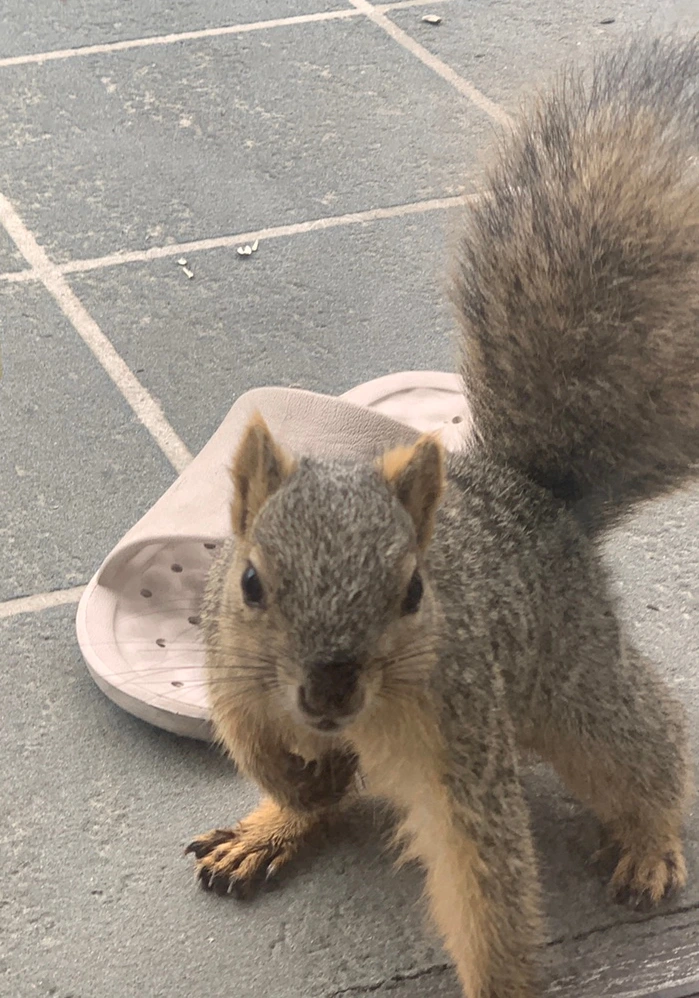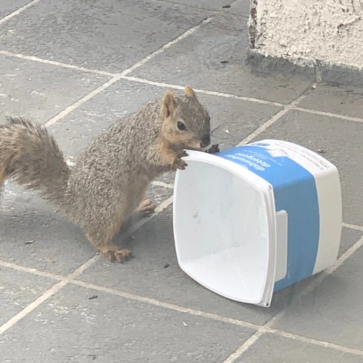 지난주부터 비가 조금씩 내렸다 그쳤다 합니다. 비에 해바라기씨 껍질이 젖으면 청소하기 힘들어서 피더를 베란다 구석에 넣고 저 아마존 식기세척기 세제통으로 덮어주었지요. 그런데 1시 30분쯤 우당탕탕!!! 해서 내다보니 다람쥐가 왔어요. 안에 뭐가 있나 통 안쪽을 여러 번 봤습니다.