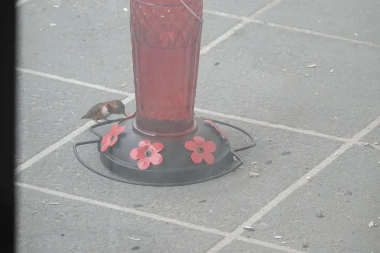 벌새 피더를 지붕에 있는 못에 걸 때 자칫 기우뚱하면 설탕물이 쏟아져서 항상 조마조마합니다. 그래서 한 번 과감히 바닥에 내려놔봤어요. 과연 벌새들이 올까요?