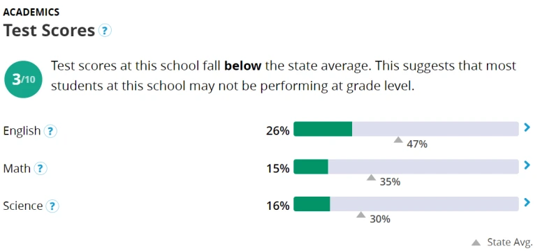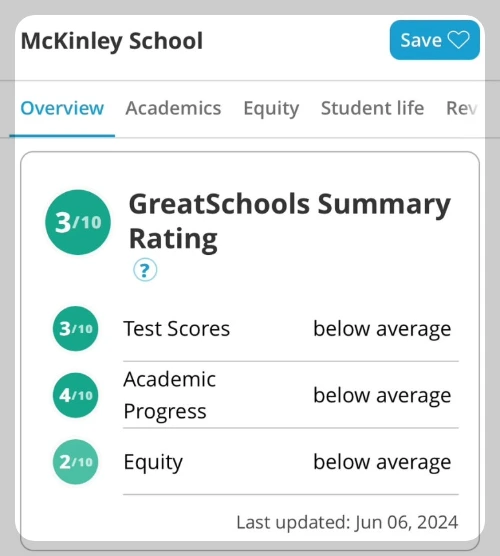 Great School 사이트(https://www.greatschools.org/)에 학교 이름과 지역명을 넣으면 10점 만점에 몇 점인 학교라고 나옵니다. 시험 성적, 발전 정도, 가정 소득, 세 가지 항목으로 정해지고, 연말에 업데이트됩니다.