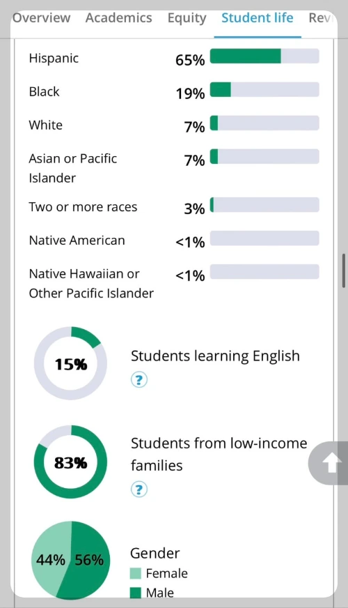 학교 구성원을 인종, 소득, 성별로 나누어 아주 구체적으로 알려줍니다. 히스패닉 65%, 흑인 19%, 백인 7%, 아시안 7%, 영어를 제2 외국어로 배우는 학생 비율 15%, 저소득층 가정에서 온 학생들 83%, 남학생이 여학생보다 조금 더 많은 학교입니다.