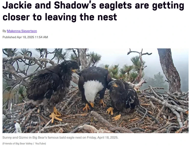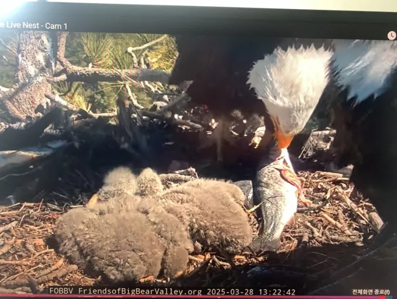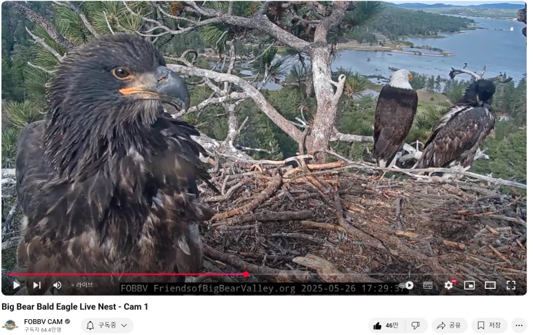 'Friends of Big Bear Valley'라는 단체에서 유튜브로 생중계를 하는 둥지라서 어디서든 독수리들의 성장과정을 볼 수 있습니다. 저희가 빅베어레이크에 놀러 갔을 때 이 채널을 틀어놓은 곳들이 꽤 있었어요.