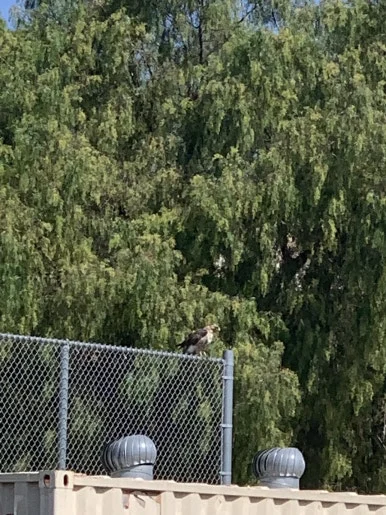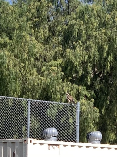 붉은 꼬리매 (Red-tailed Hawk)가 자주 학교에 와서 쉬는 시간에 놀다 보면 자주 본다고 했었어요. 제 눈앞에도 왔습니다 ㅎㅎ 펜스에 가만히 앉아 있었어요. 마치 조각상처럼요. 그런데 이 평화를 깬 두 녀석이 있었으니 바로!