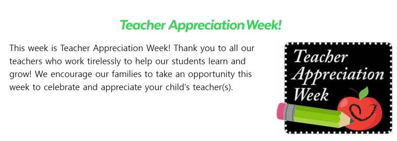 일주일 내내 선생님께 감사를 표하는 스승의 날 주간이 있습니다. 교장선생님께서 전체 학부모에게 보내시는 이메일에도 공지하셨습니다.