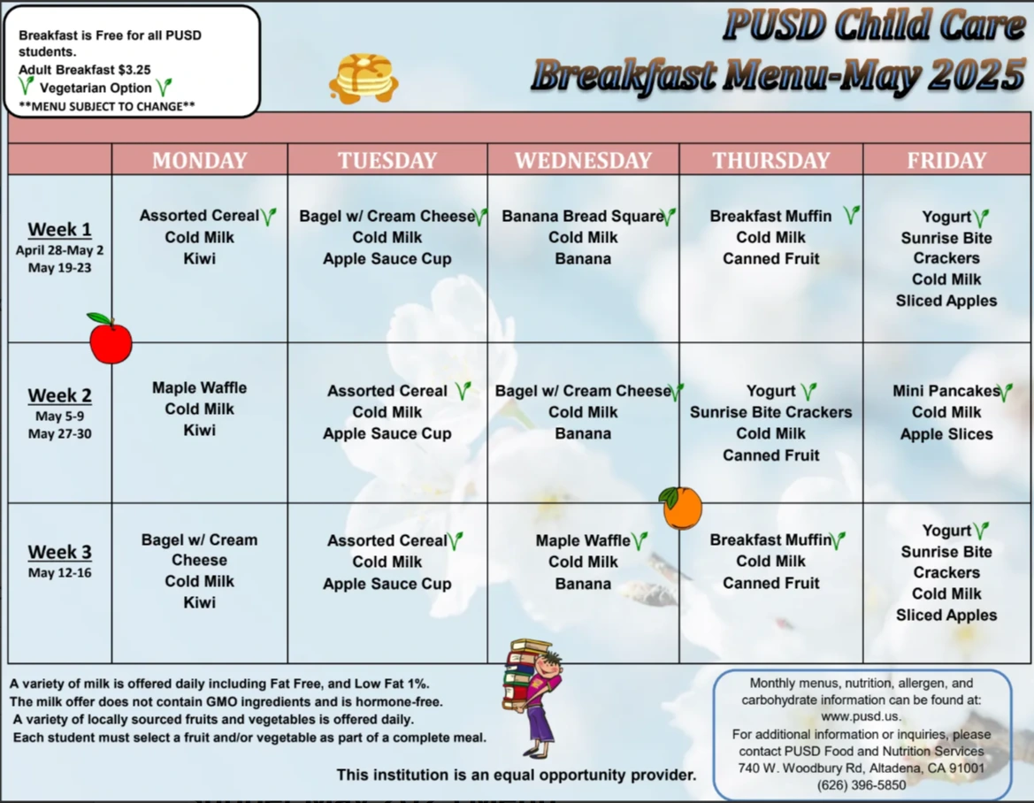 2. 학교 급식 : 교육구 홈페이지에 메뉴 공지(https://www.pusd.us/departments/food-nutrition-services/menu)