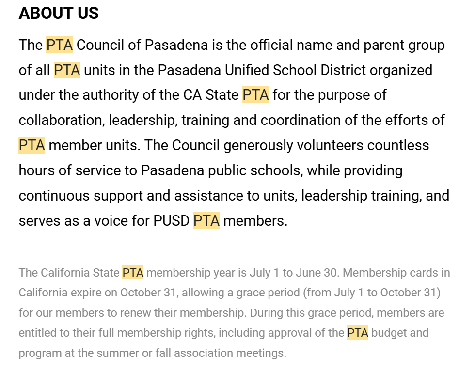 패서디나 통합교육구(PUSD) 모든 PTA 지부의 상위 단체이자 공식 명칭입니다. 협력, 리더십, 교육, 지부 활동 조정 등을 목적으로 하며,