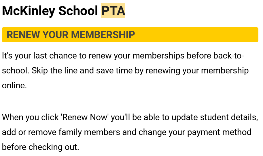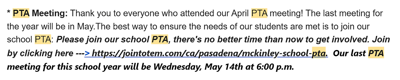 큰 아이 담임 선생님께서는 매주 주간 학습 계획과 학교 행사 내용을 담은 이메일을 보내셨습니다. 마지막에는 항상 "PTA에 가입하세요!" 하는 단락이 있었고요.