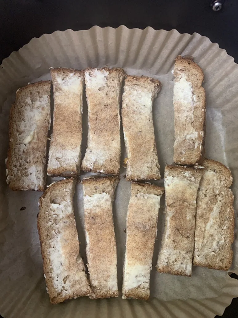 빵에 버터 슥슥 바르고 시나몬 설탕 휙휙 뿌린 후 잘라서 에어프라이어에 15분쯤 구웠어요.