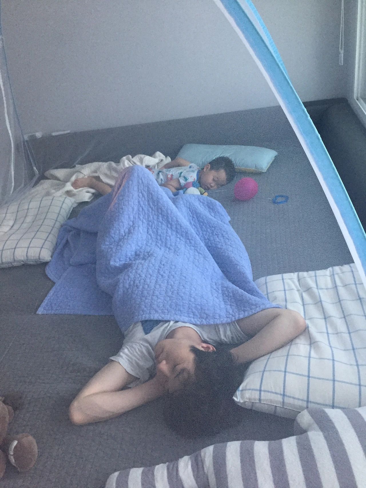 좀비 놀이를 하며 하도 뛰어다니길래 아래층의 아기가 낮잠을 자다 깨겠다 싶어, 차라리 침대 위에서 뛰라며 침대로 쫒았던 건데 거기에 샐리가 있었다.