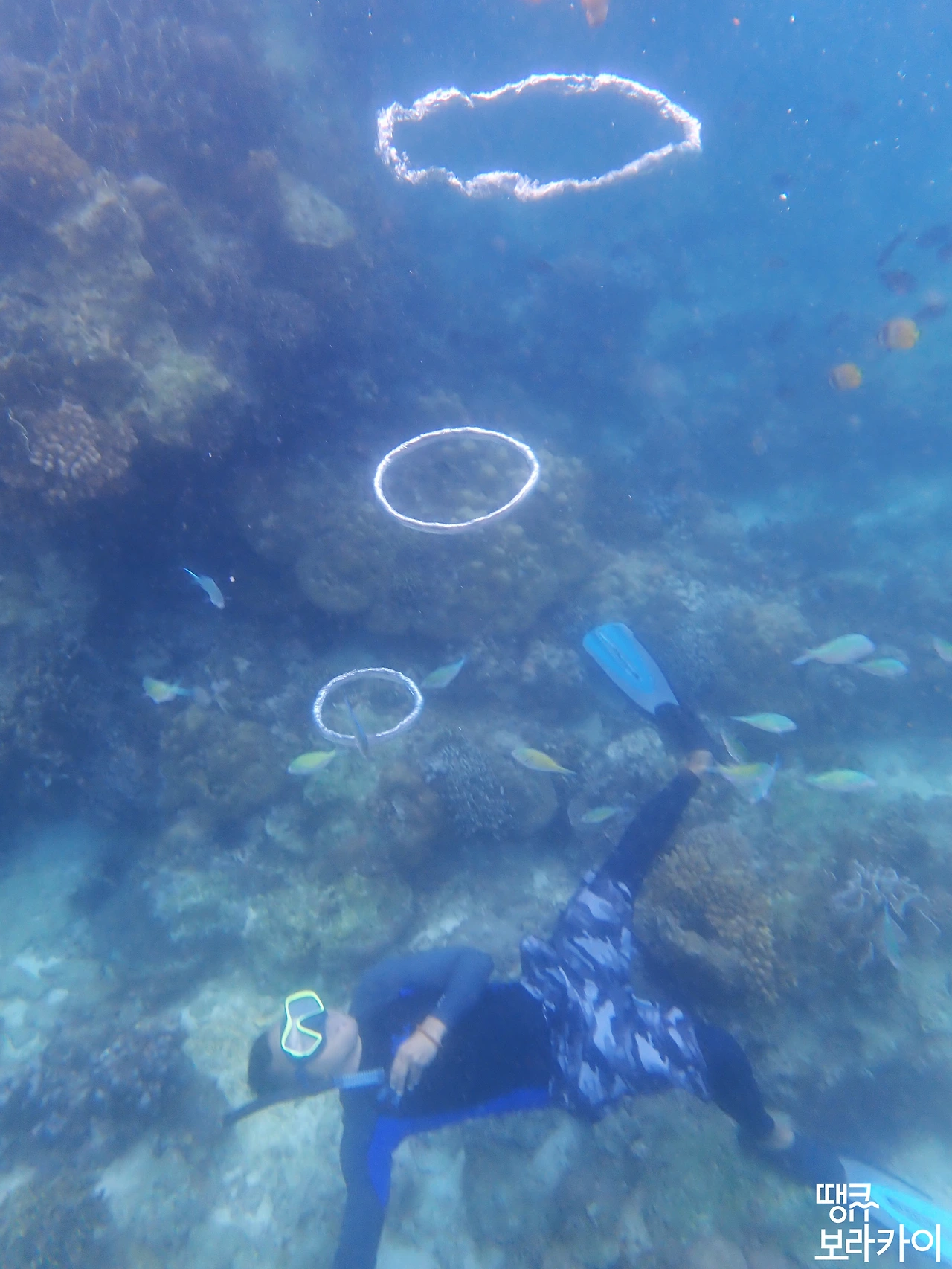 바닷물이 닿으면 여전히 조금 힘들었고 겁이 나던 아들은 호핑 초반까진 물에 들어오지 못했다. 남편과 내가 계속 같이 들어가 보자고 해도 아들은 망설였다. 수영도 못 하면서 흥만 넘치는 애미 애비가 불안했으리라. 우리가 물에서 노는 동안 아들 옆엔 제이피가 있었고, 삼촌이 바로 옆에서 잡아줄 테니 들어가 보자 하던 제이피의 설득으로 아들은 결국 바다에 들어왔다. 제이피가 이끄는 대로 물 위에 둥둥 떠서 물고기도 보았고 물 안에서 도넛을 만들던 제이피의 재주에 놀라 그건 어떻게 하는 거냐 물으며 도넛 만들기를 배우기도 했다. 남편과 아들은 패들보드도 탔고 제이피가 잡아준 복어를 보며 신기해하기도 했다.