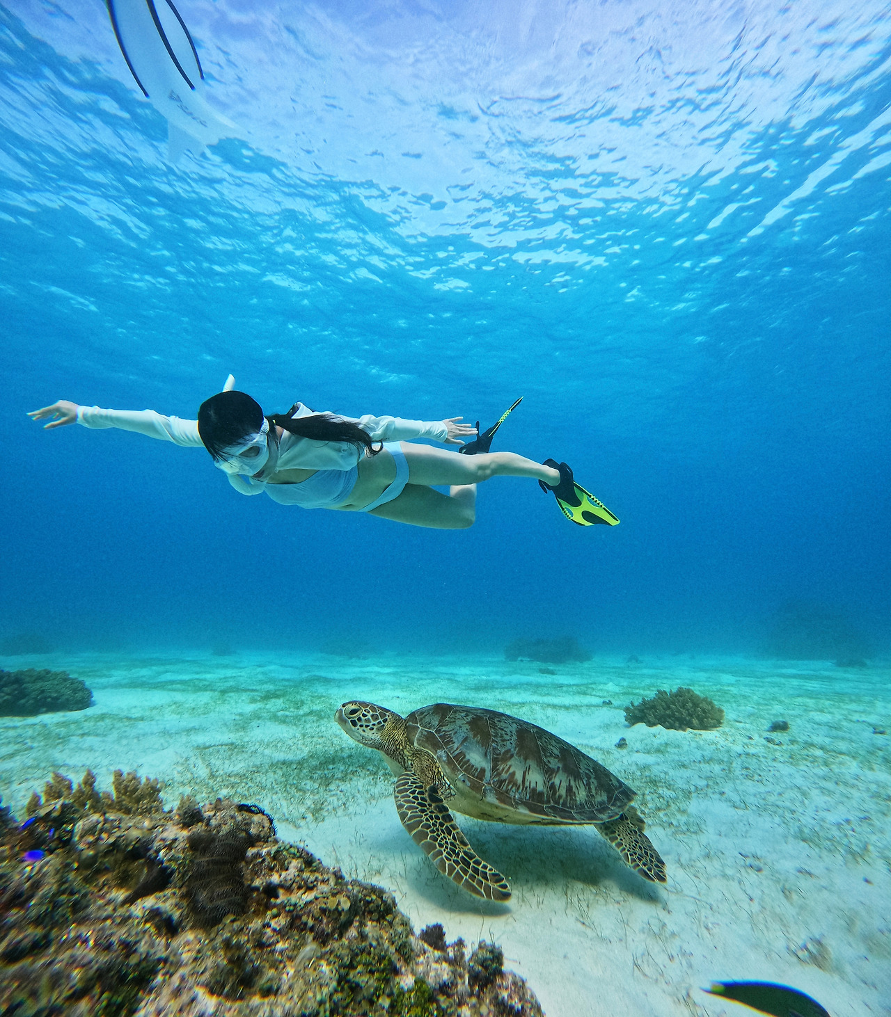 문득 궁금했었다. 그분이 감각하는 바다는 어떤 느낌일까. 파도의 일렁임을 진동으로만 느낄 때의 바다는 대체 어떤 바다일까. 혹여 불편함이나 두려움은 없을까. 실은 조금 걱정도 되어 잠수를 하다가도 그분이 괜찮은지 살피고 있었는데 갑자기 그분이 내게 손짓을 하며 옆으로 다가간 내 손을 끌어당겼다. 함께 바다 안으로 들어가 보자는 말인지, 본인을 잡아달라는 말인지 이해하지 못하여 조금 어리둥절해하다가 가이드 분께 사진을 찍어달라는 동작이 이어지고 있어 함께 들어가 보자는 말이구나, 깨달았다.
