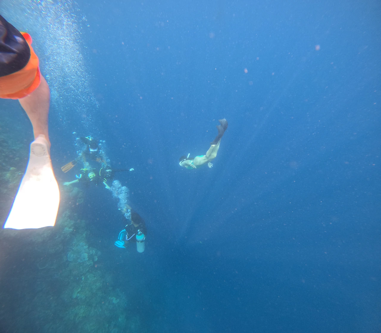 나는 수업 첫날부터 이퀄라이징이 바로 되어서(내가 프렌젤을 이미 할 줄 알더라고? 아마도 내가 도리라서 그런 것 같다고 다시금 확신) 5~6미터는 쉽게 내려갔으며 덕다이빙 자세가 아주 훌륭하진 않아도 수심을 뚫고 들어가기엔 큰 무리가 없었다. 이퀄라이징을 할 때마다 고막이 "지이이잉"소리를 내며 펴졌는데 그 작고 가느다란 그 소리를 처음 듣는 순간 너무 놀라서 선생님을 붙잡고 큰 소리로 물었다. 스앵님, 귀에서 뭔가 작고 귀여운 동물소리를 내며 우는데 제 고막인가요?