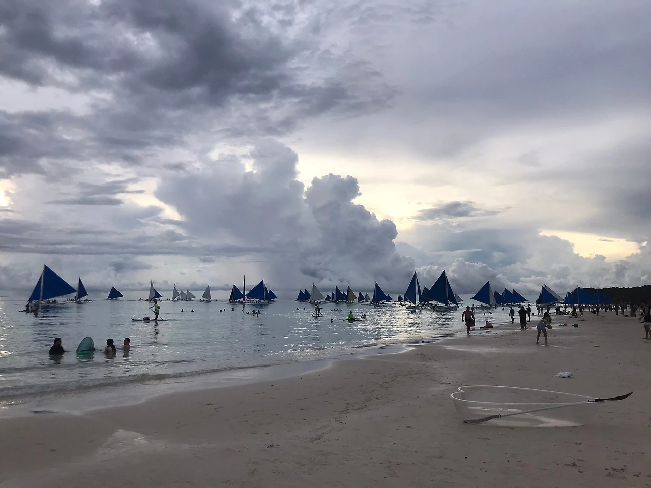 그 시간엔 "돛단배?" 하는 호객행위도 끊이지 않는다. 보라카이의 상징인 파아란 돛단배.