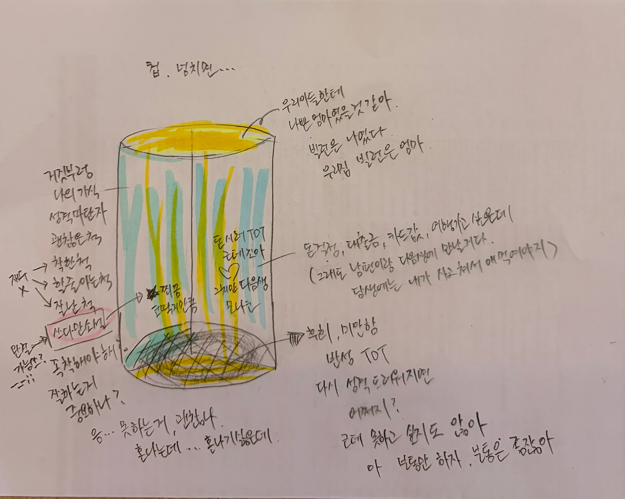 어쨌든 몇 번 그려본 끝에 내린 결론은 내 컵은 대충 세 구역 정도로 나누어져 있다는 것이다. 그리고, 아마도 그 어딘가엔 '쓰다만 소설'도 자리하고 있는 듯하다. 그래서, 그날. 남편과 김치찌개를 먹던 중에 옆 테이블의 대화가 귀에 콕 박혔던 것이겠지.