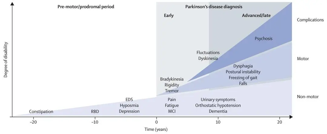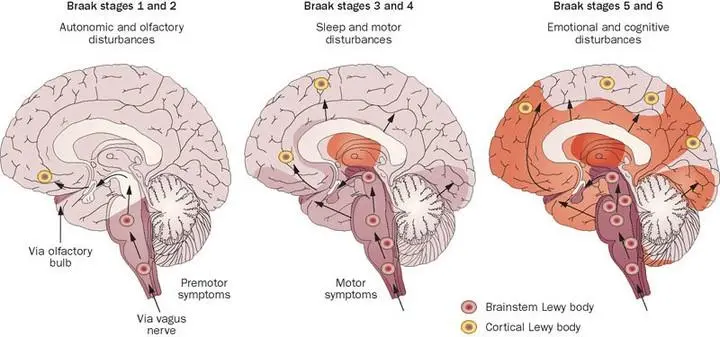stage 3-4에 중뇌부위의 도파민 신경 밀집부위인 흑질에 퍼져나갈 때 흑질 도파민 신경세포 사멸에 동반되어 운동능력 감퇴가 나타나며 이후 대뇌피질 영역으로 병변의 영역이 확장됨에 따라 환시, 정신증이 나타납니다. 그리고 변비가 나타나는 장은 미주신경이 연결된 부위고, 후각멍울 또한 앞에서 설명한 기능저하와 왠지 연결된 것 같습니다. 기가 막힌 우연일 뿐일까요?