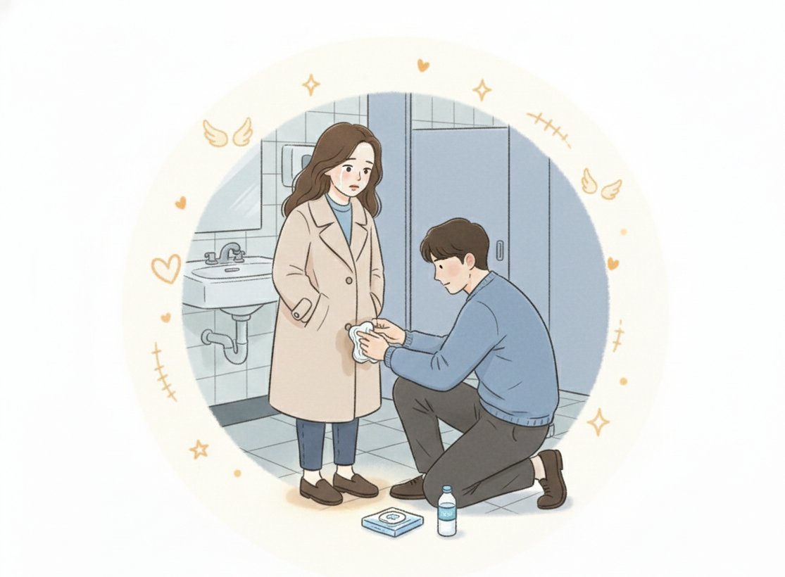 화장실 문을 열고 나온 내 앞에 나타난 그의 손에는 편의점에서 급히 사 온 생수와 물티슈가 들려 있었다. 화려한 위로의 말 대신 묵묵히 내 옷에 묻은 얼룩을 닦아내기 시작했다.