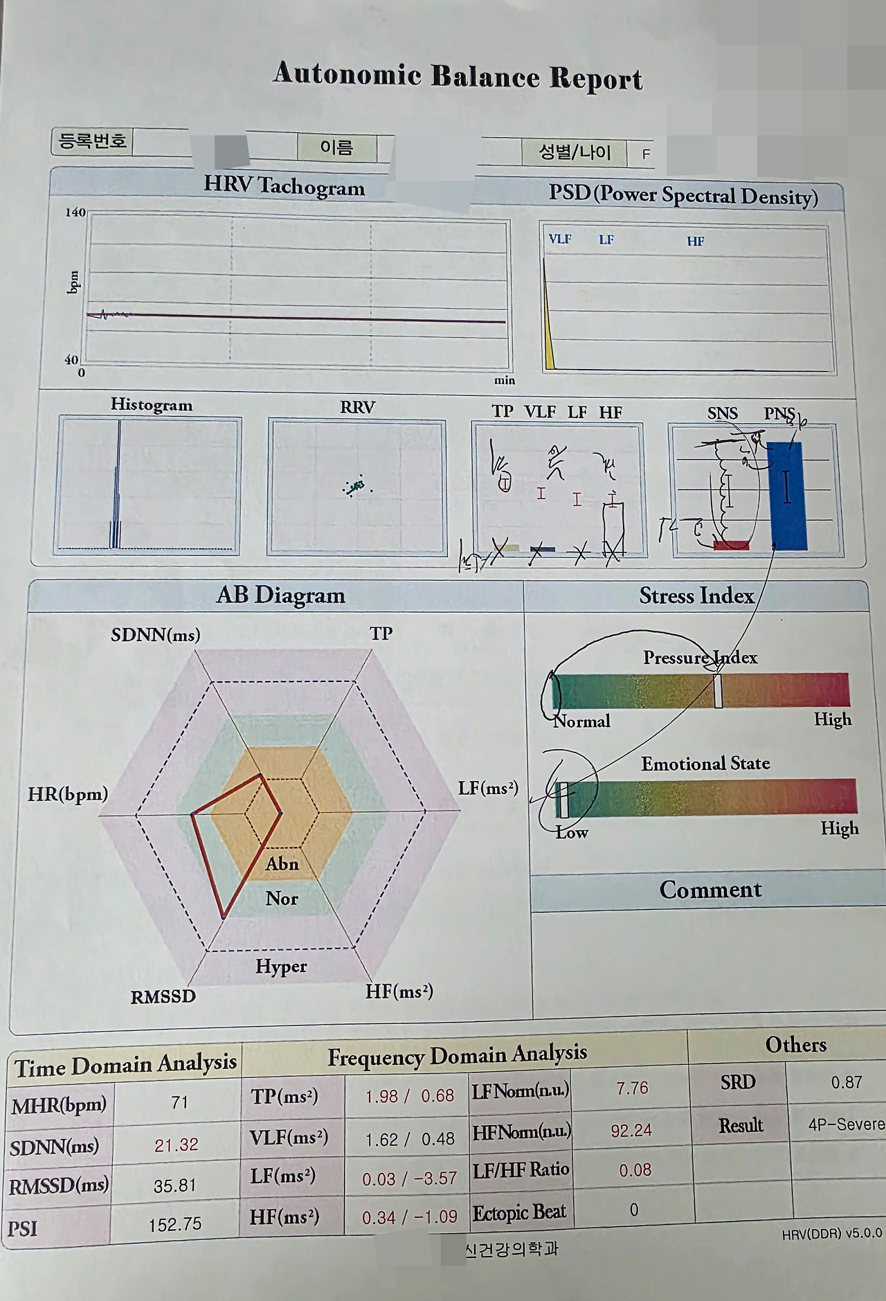 "몸이 극도로 피곤한 상태입니다. 신체적 스트레스를 엄청나게 받고 있다는 증거예요. 자율신경계 조절 능력이 바닥입니다."