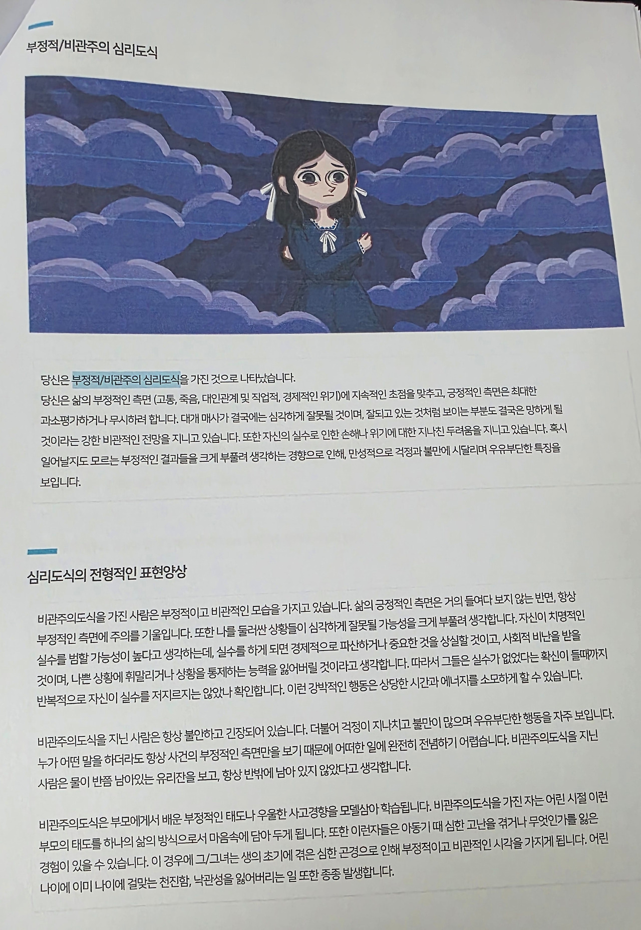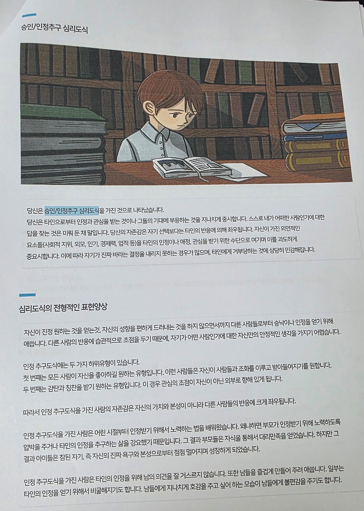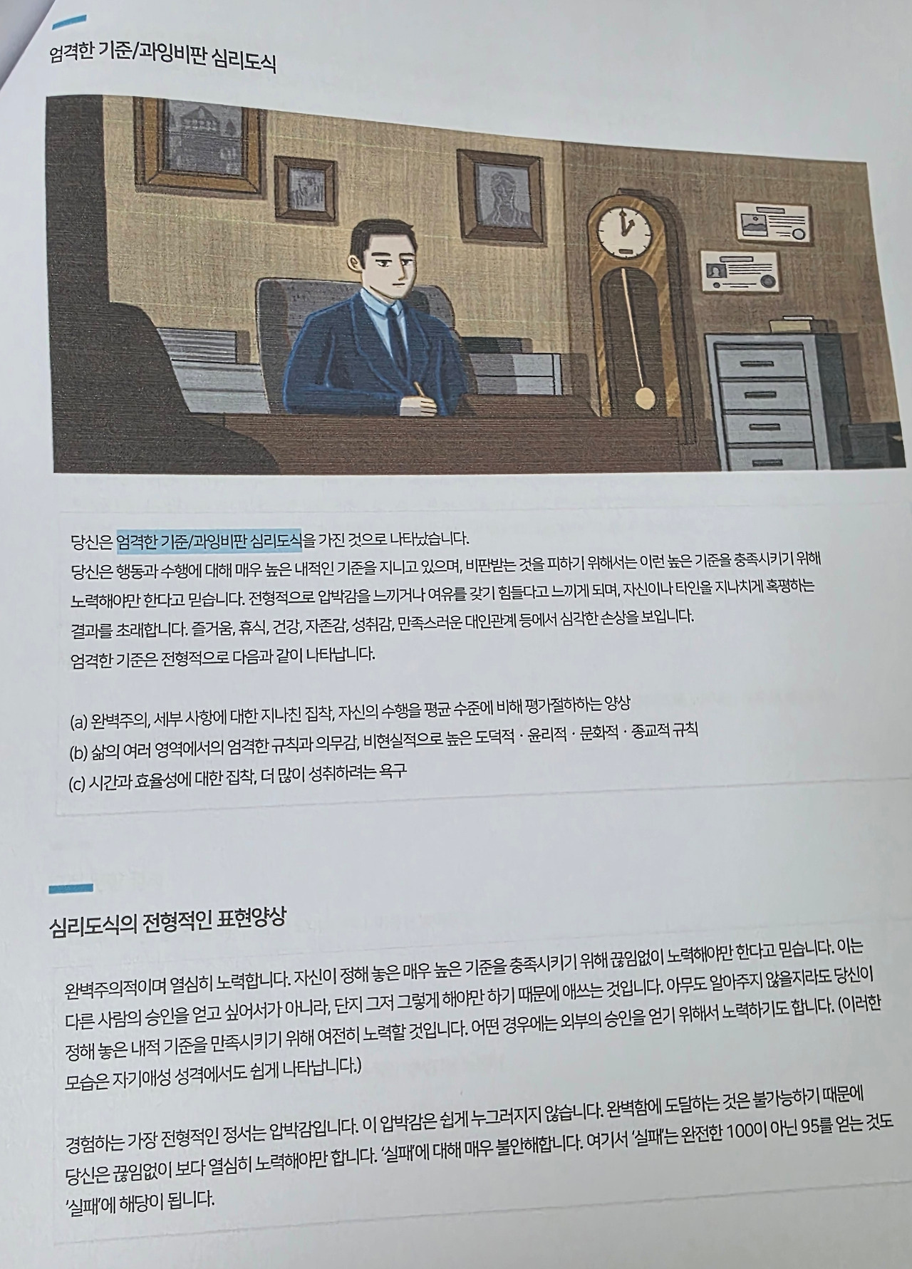 "꼼꼼하고 완벽하려고 노력하는 성격이죠? 심리 도식 검사에서도 '엄격한 기준'과 '인정 추구'가 아주 높게 나왔어요."