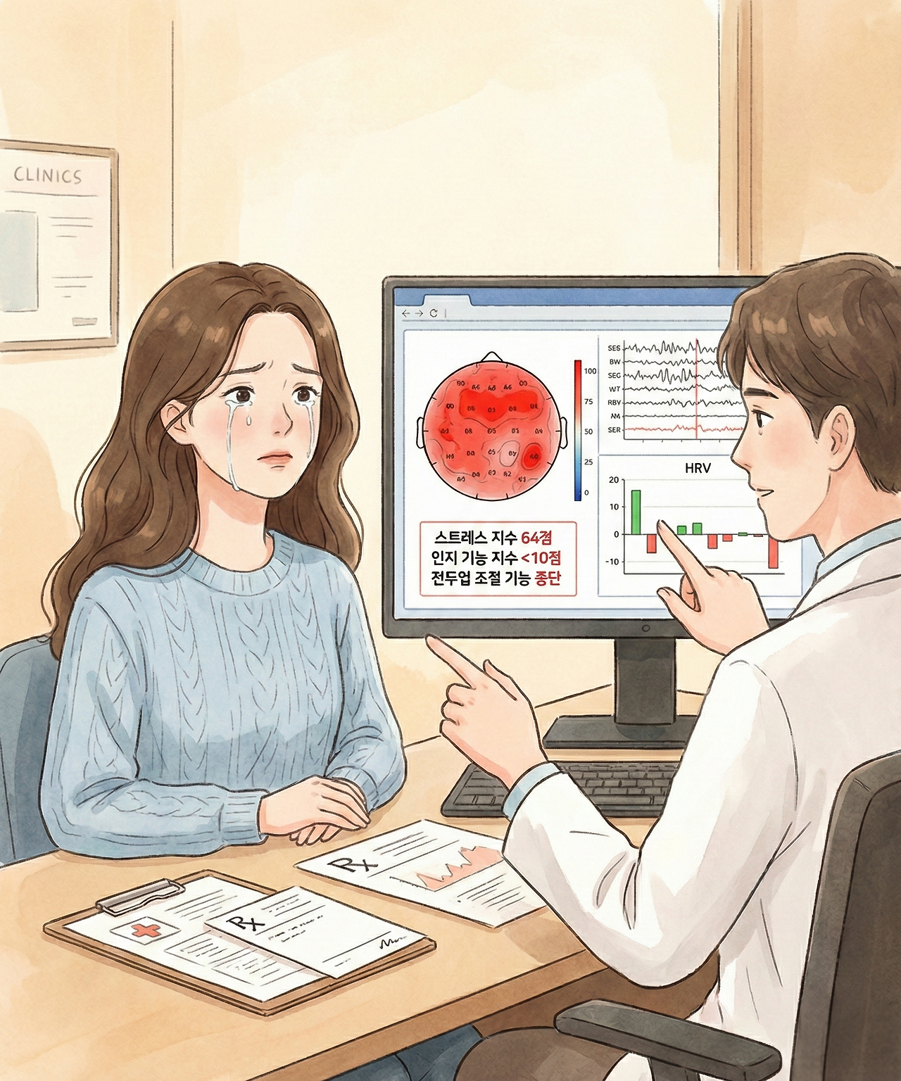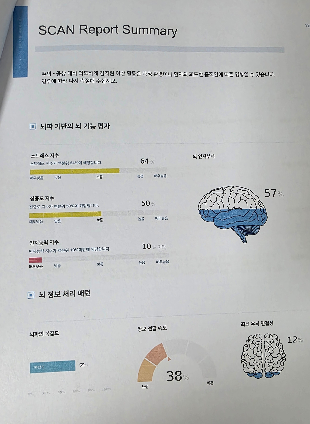 "스트레스 지수는 64점으로 높고, 인지 기능 지수는 10점 미만입니다. 전두엽의 조절 기능인 알파파가 작동을 멈췄어요."