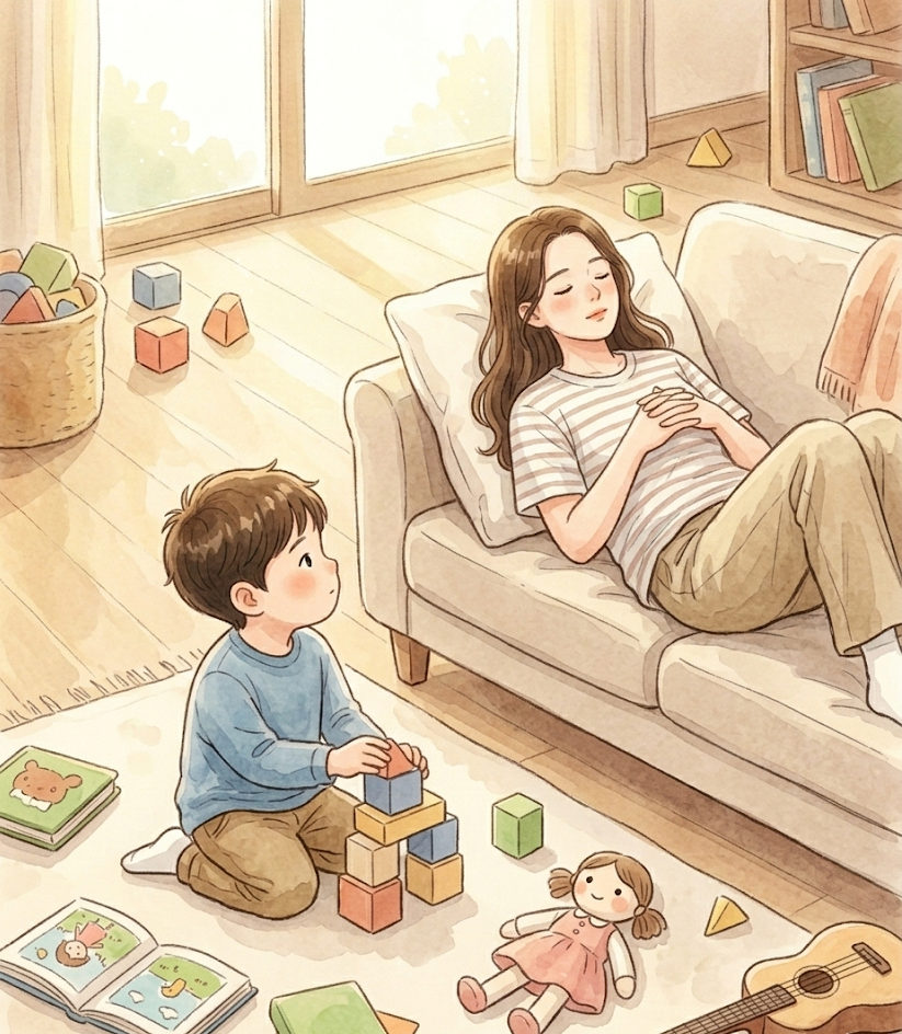 아이가 심심하다고 조를 때마다 즉각적인 재미를 대령하는 '엔터테이너'가 될 필요는 없습니다. 엄마의 한계를 명확히 설명해 주세요. "엄마는 지금 약을 먹어서 30분 동안 누워서 쉬어야 해. 그동안 혼자 재밌는 장난감을 찾아볼까?"라고 말하며, 아이 스스로 지루함을 견디고 자신만의 놀이를 창조해 낼 시간을 허락해 주세요.