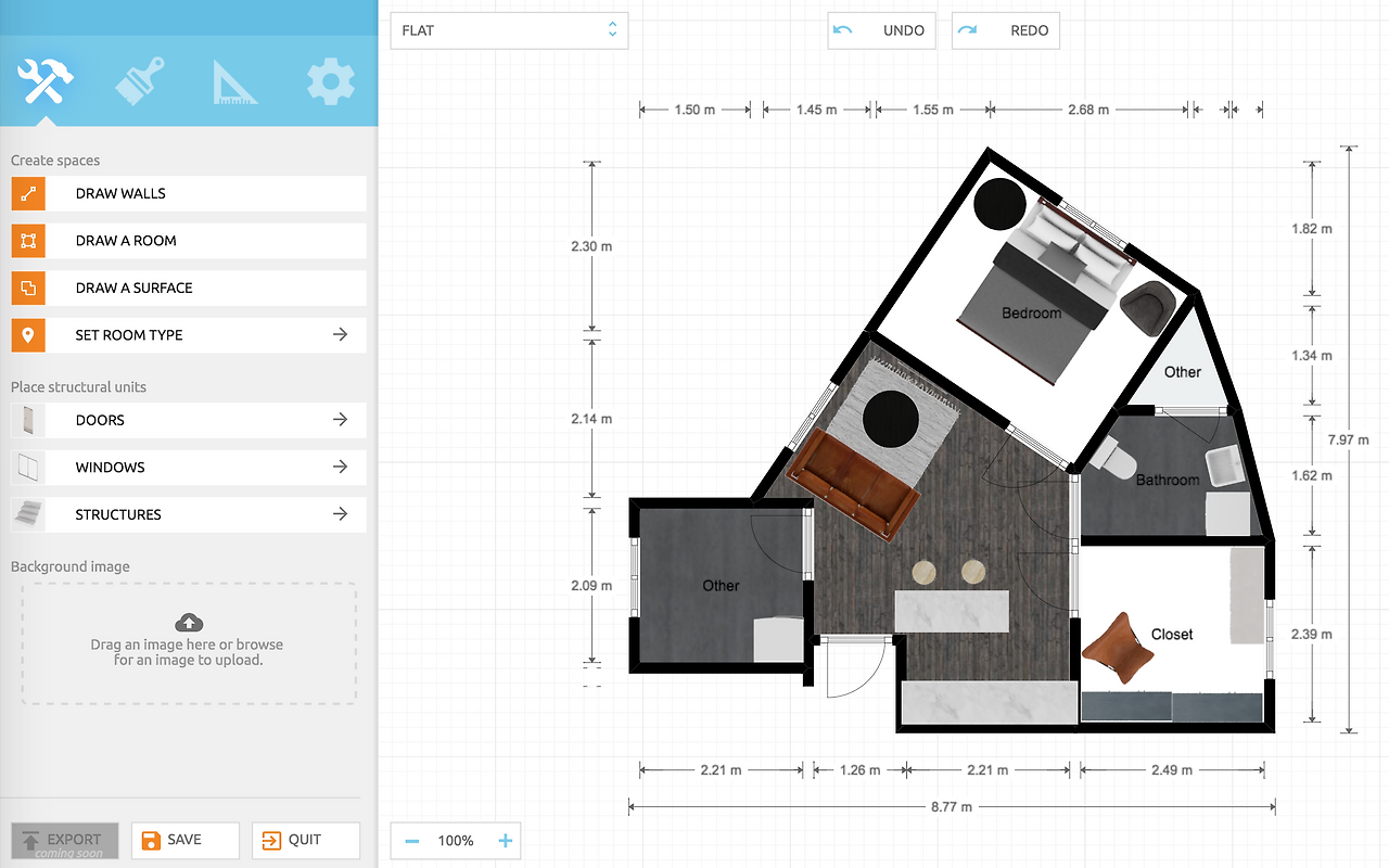 계약하자마자 집 치수를 잰 후 https://www.floorplanner.com/ 에 어떤 집을 만들지 구상해 봤다. 작은 집이라 어차피 용도가 뻔하긴 하지만 그려서 정해 놓으니 계획서가 생긴 느낌. floorplanner가 진짜 최고인게 도면 그리는것도 넘 쉬울뿐 아니라 샘플 가구들도 배치해서 3D로 렌더링 해준다. 공짜로 쓸 수 있는 툴로는 이게 짱일듯.