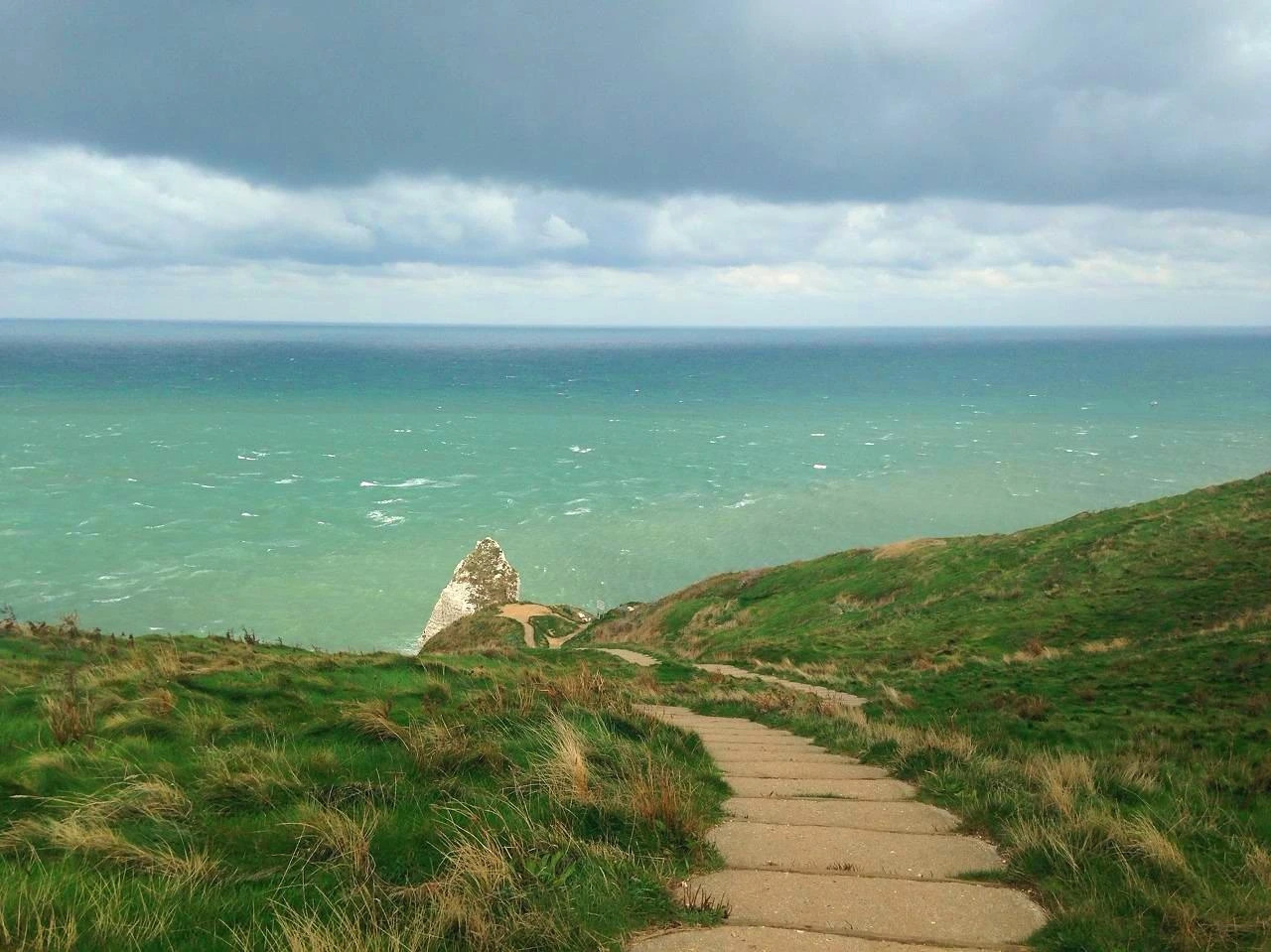 차를 타고 언덕을 올라가다 어느순간 갑자기 바다가 나타난다. 긴 잔디들이 바람에 다 누워있는 언덕이었다. 그 언덕에서 바다와 절벽이 동시에 눈에 들어오는게 꽤 멋지다. 우와! 하는 감탄사를 연발하게 되는 풍경. 바람이 너무많이 불어서 가만히 서있기 힘들었지만 열심히 감상했다. 코끼리 모양 절벽이 있는 단순한 풍경인데 계속 보게되는 힘이 있다. 무엇보다 바다색이 정말 오묘했다. 탁한 애매랄드색. 우유에 민트색을 섞어놓은 것 같았다. 거기에 흰 코끼리 모양 절벽이 있는 풍경이라니 게임 그래픽 같았다. 자연에서 흰색을 만나면 되게 낯설게 느껴진다. 눈이 오면 늘 보던 동네도 낯설어진다. 잘 없는 색이라 그런걸까. 흰색 절벽과 초록색 잔디, 민트색 바다가 한데 어우러지다니, 완전 예술이다. 아닌게 아니라 예술가들의 사랑을 받던 휴양지라고 한다. 모네가 그린 작품도 있고. 인상파 화가들이 좋아하던 곳이라면 날씨 변화가 다양해서 였을까. 왠지 인상파 화가들을 생각하면 같은 곳을 끊임없이 다르게 그려내는 모습이 연상된다. 그러면 그 장소를 좀 더 이해하고 사랑할 수 있게 되려나. 엄청 낭만적이잖아!