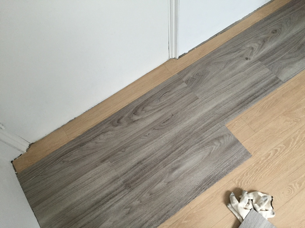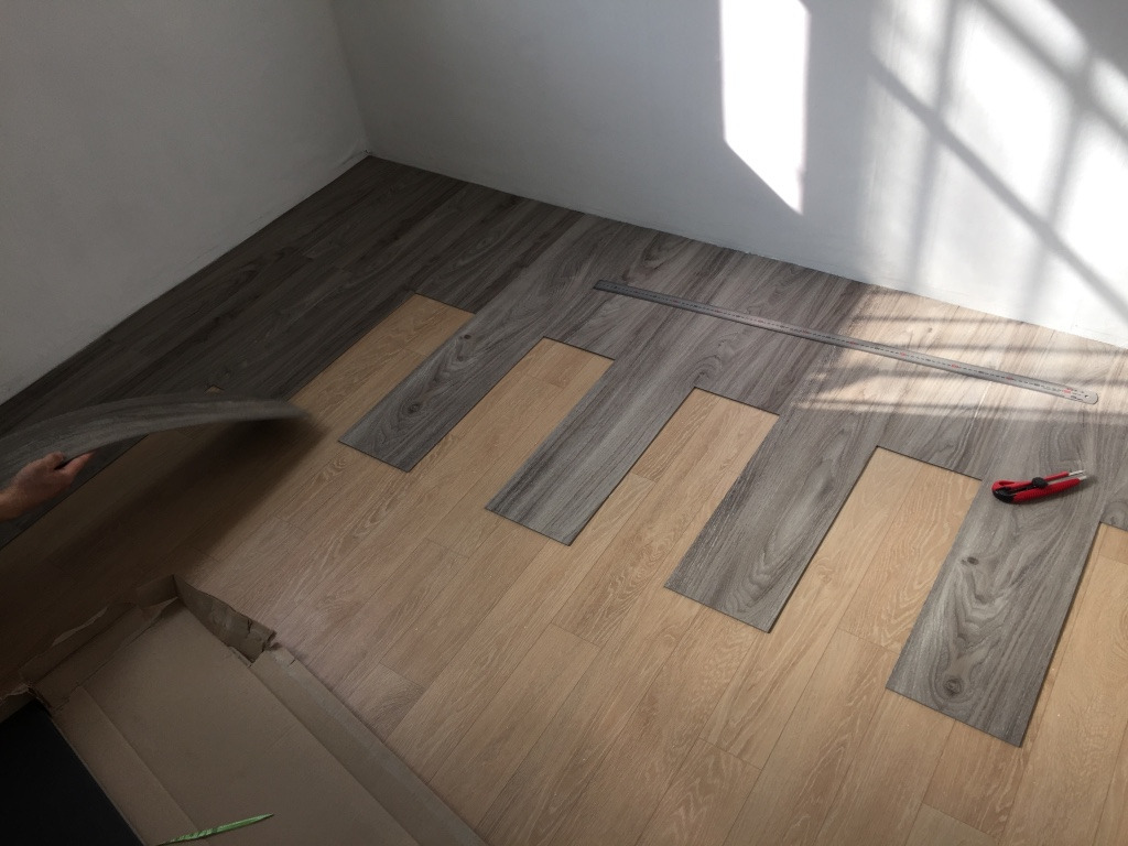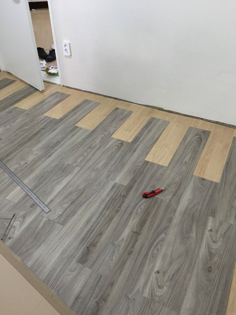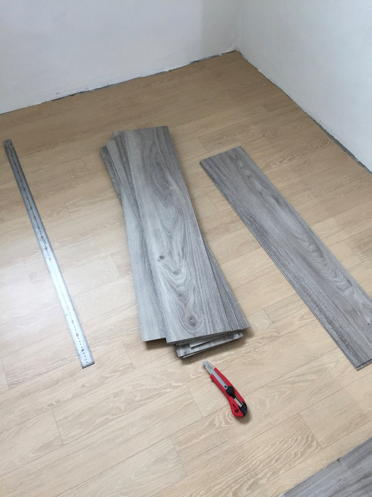 헤링본에 비하면 반의 반값도 안되는 데코타일로 결정했다. 데코타일의 장점은 다양하다는 점이다. 색깔도 재질도 정말정말 다양하다. 원하는 느낌대로 고르기만 하면 된다. 방산시장은 정말 천국과도 같은 곳이었다. 원래는 아주 짙은 고동색으로 나무문양의 바닥재를 고르려고 간거였는데 막상 가보니 회색빛이 도는 나무무늬 데코타일이 눈에 띄었다. 가게에서는 1m X 0.15m 정도의 샘플만 보고 골라야 한다. 그래서 전체 바닥에 깔면 어떤 느낌일지 감이 잘 안왔는데 마침 우리가 고른 데코타일은 전체 시공 예시 사진이 있었다. 북유럽에 가보진 않았지만 어쩐지 북유럽 느낌이 나는 사진을 보고 바로 결정했다.