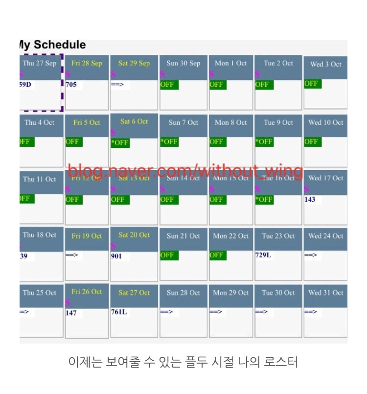 플두 시절 나의 2018년 10월 로스터 이다. 날짜를 보면 알지만 스왑을 해서 난 17일의 OFF 를 만들었고 10월 27일엔 100시간 짜리 사라예보 레이오버를 다녀왔다.