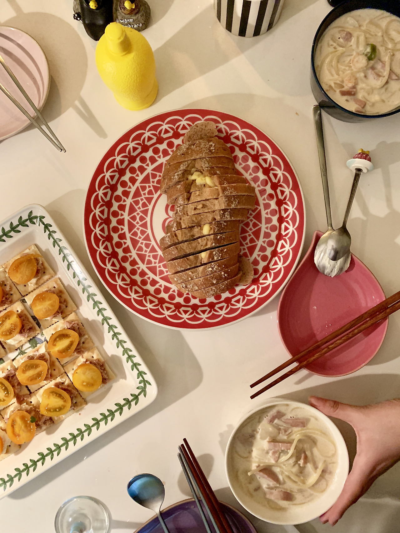 4. 짬뽕 국물에 청경채, 체다치즈와 삶은 면을 넣고 잘 뒤섞은 뒤 바게트나 치아 버터와 함께 담아내기.