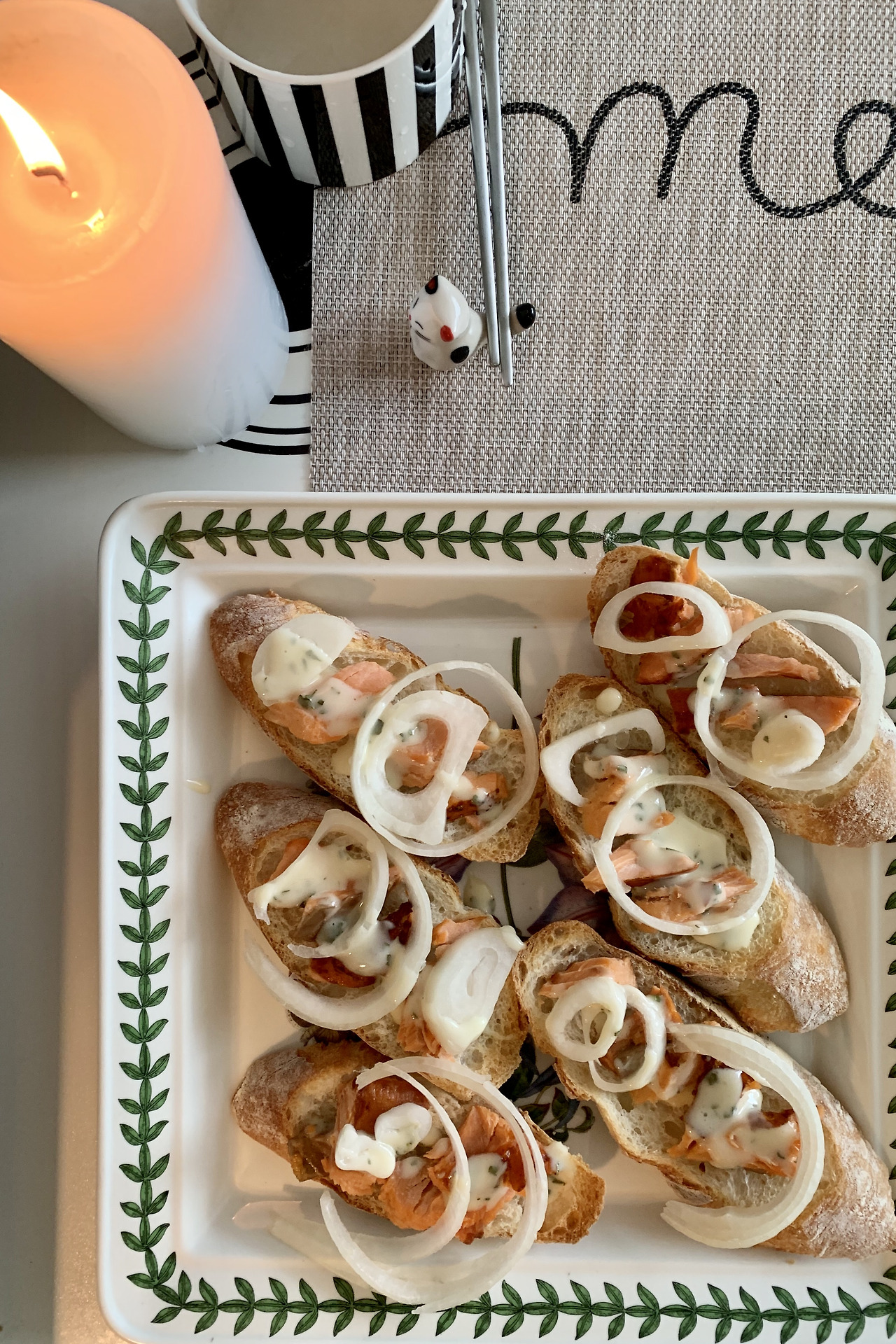 ▷ 훈제 연어 170g, 바게트 슬라이스(1통), 양파 1개, 마요네즈, 설탕, 레몬즙, 카놀라유