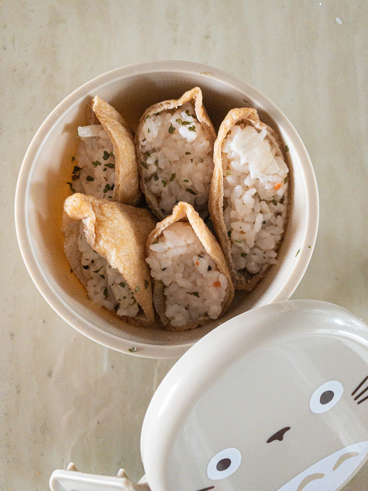 3. 유부주머니를 꾹 눌러 물기를 빼낸 뒤, 입을 벌려 준비한 쌀 밥을 담기