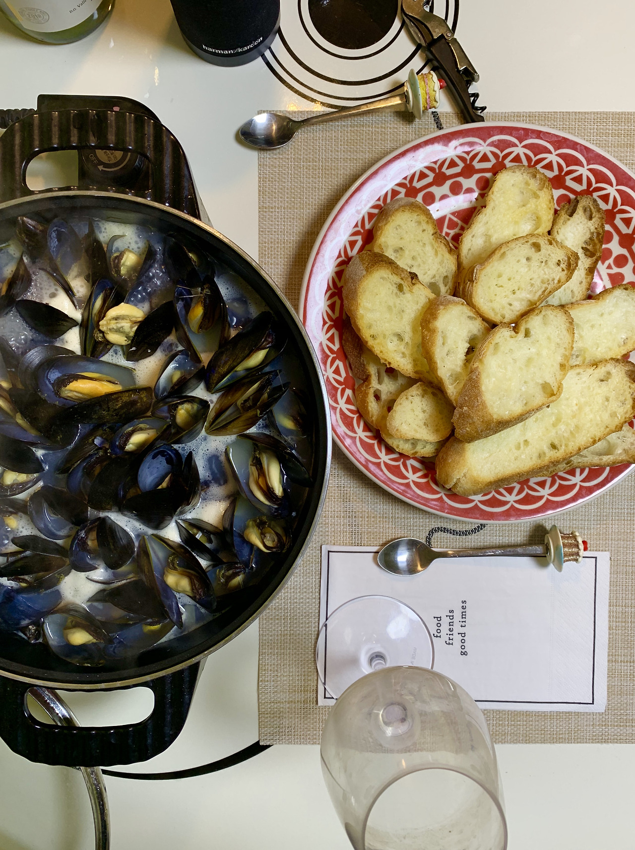 6시, 손질한 홍합에 와인과 물, 홍고추를 넣어 끓이면