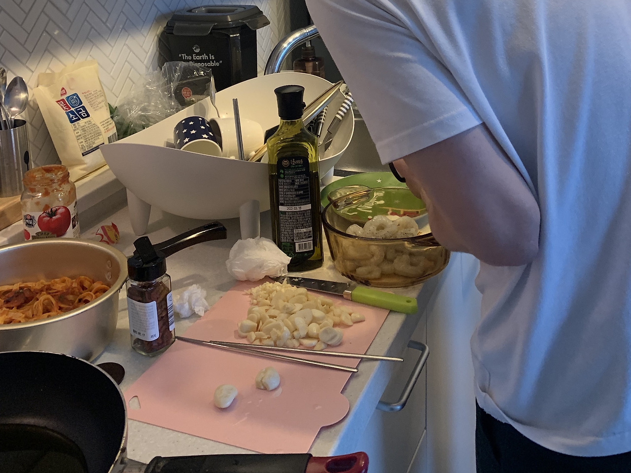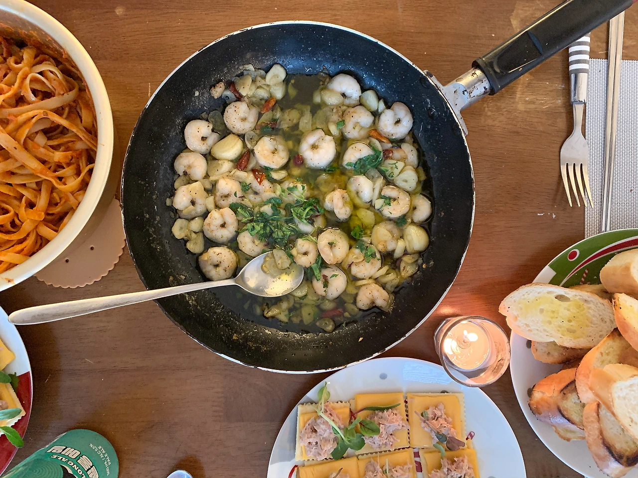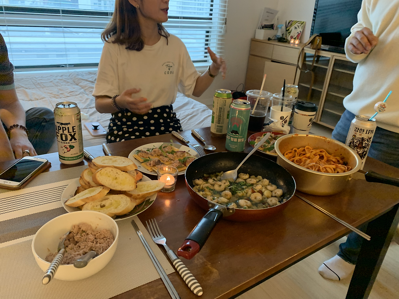 현은 약속보다 정확히 2시간 일찍 도착해서 부엌 장비의 케파(capacity)를 꼼꼼히 살피고 잠시 고민하더니 곧장 필요한 레시피와 재료를 뽑았다. 나는 쫄래쫄래 장 보는 걸 따라다니고 필요한 조리 도구의 위치를 알려주기만 했을 뿐이고. 간단한 카나페를 만드는 동안 부엌에서 통통 야채 손질하는 소리가 나더니 그 후로 뜨끈한 바게트, 새우로 만드는 감바스 알 아히요와 베이컨 토마토 파스타까지 만들어 내는 것이다. 들뜬 마음으로 새우를 접시에 담으려 하자 현이 요리를 슬쩍 빼며 자못 진지하게 말했다. ‘잠깐, 이건 원래 팬에 담아내는 거야’.