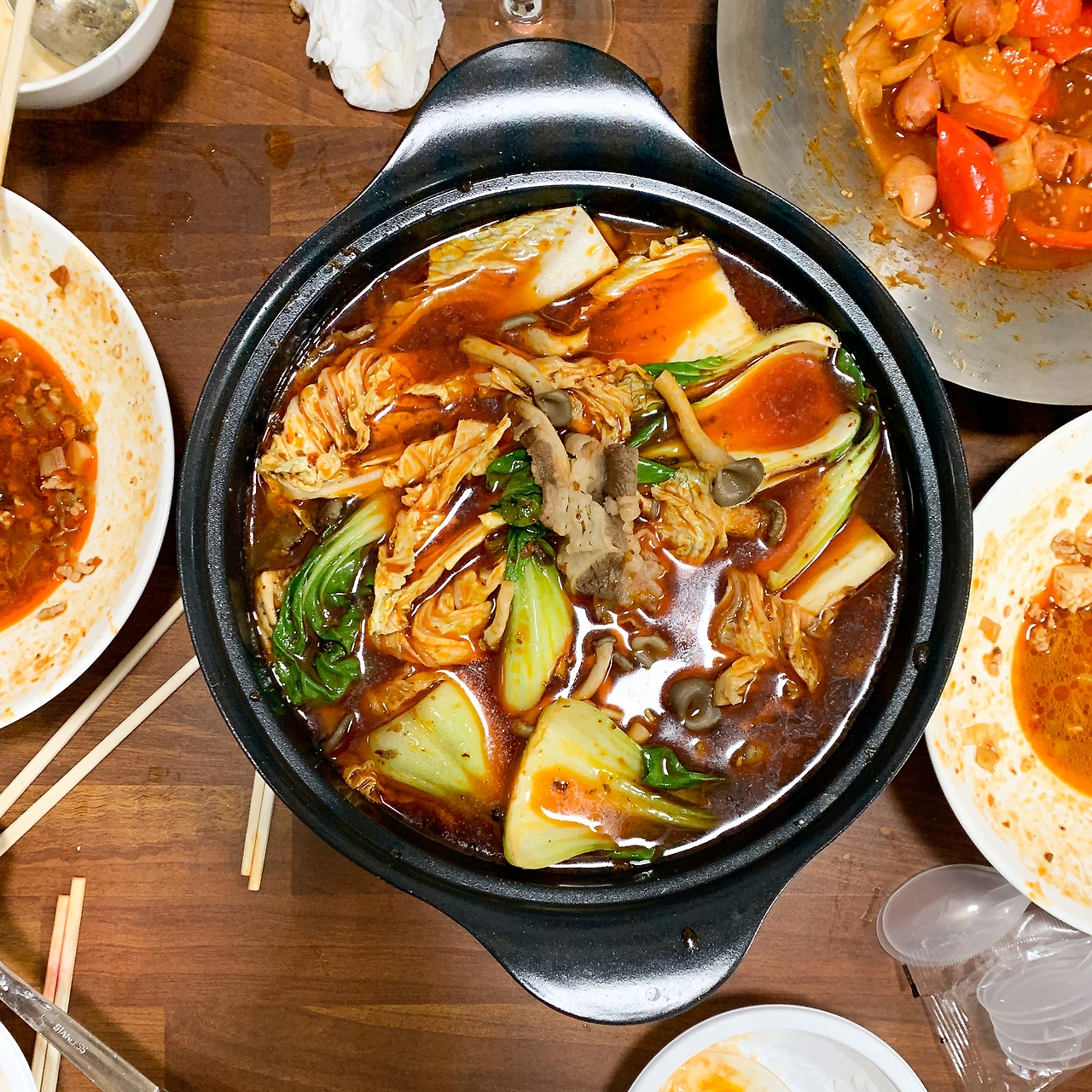 4. 마라 소스를 푼 뭉근한 육수를 붓고 손질한 숙주, 청경채를 넣고 익혀 마무리