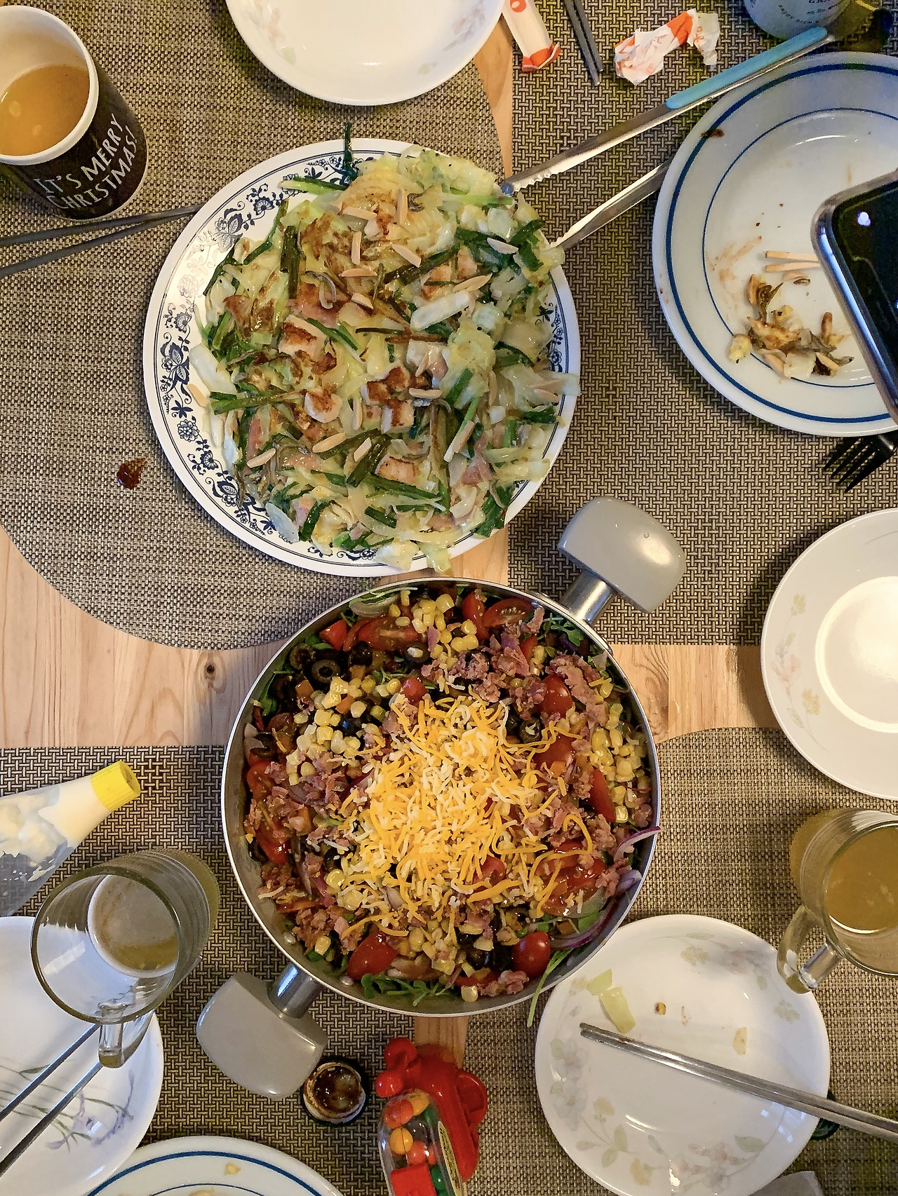 - 야. 이건 파전이 아니라 그냥 ‘파’잖아. 반죽도 거의 없고. 베이컨 하고 닭가슴살은 왜 넣는 건데?