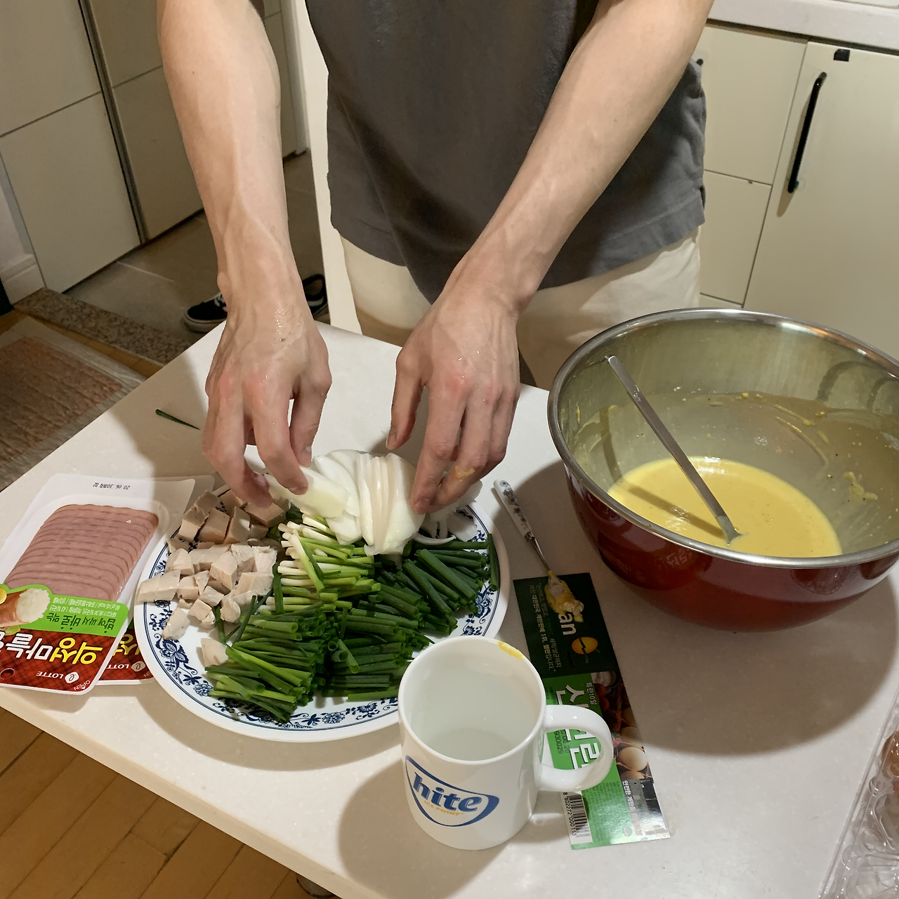 나 “어우~ 재밌었겠다. 난 어제 친구들 집에 불렀어. 비가 오니 식용유 지글지글 둘러서 파전이 먹고 싶잖아.”
