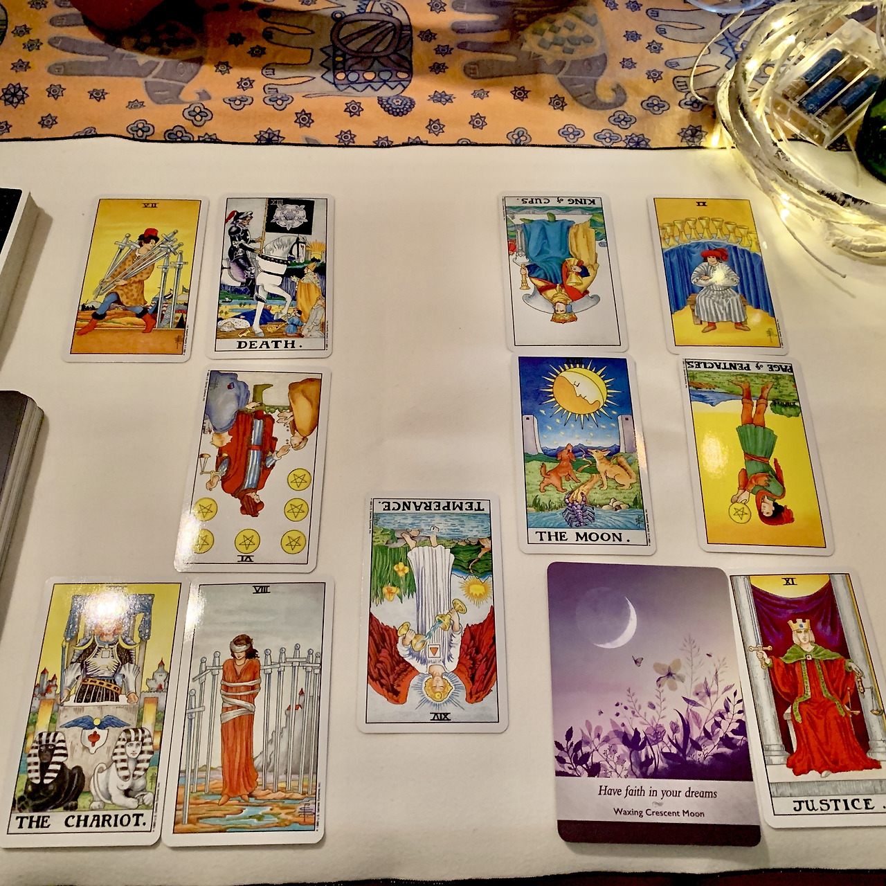 그 후로도 역동적이고 우울하거나 때로는 기괴한 삶의 스펙트럼이 하얀 덱 deck 위에서 펼쳐졌다. 카드 한 장 한 장뿐 아니라 의외의 조합을 풀이하려고 이야기를 엮는 과정에서 내가 잊었거나 무시하고 넘어갔던 기억들이 생각지도 못하게 엮여 나와, '읽씹' 했던 마음의 메시지를 되돌아본다. 개인적인 카드점 결과는 말할게 못되지만, 한 가지 분명한 건 정신을 차리고 보니 촛불 앞에서 카드 속 내러티브를 따라 숨겨둔 이야기를 술술 실토하고 있던 나였다. 즉, 답은 정해져 있고 너는 뽑기만 하면 되는 거야.
