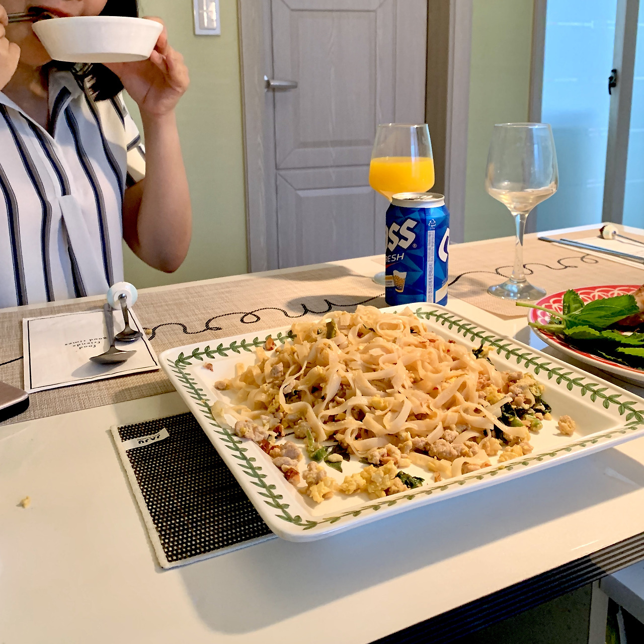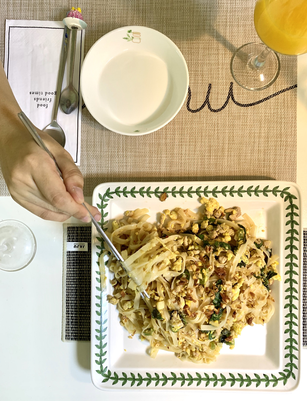 팟타이는 시간이 지나면 퉁퉁 불기 쉬워서, 닭구이를 먼저 만든 후 팟타이를 볶는 순으로 상을 차릴 예정이다. 팟타이란 태국의 볶음 쌀국수 요리로, 집에 흔히 있는 굴소스와 마성의 고린내를 풍기는 피시소스의 황금비율로 웬만한 손님 입맛을 사로잡기 충분하다. 여기에 땅콩이든 아몬드든 집에 있는 흔한 견과류를 잘게 부숴서 고명으로 올려주면 달콤하고 고소한 맛 또한 별미.