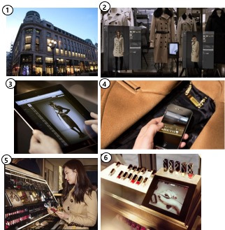 온라인 스토어와 오프라인 매장의 결합은 버바리의 리테일 혁신전략의 정점을 찍는데, 영국 런던의 피카다리 서커스 리젠트 거리에 있는 플래그십(Flagship) 매장에서 그 결실을 볼 수 있다(Figure I-14-①). 저자도 2014년 해당 매장을 방문한 적이 있었는데 화려하게 꾸며진 명품 매장의 외형을 넘어서서 옷 근처에 가면 거울에서 해당 옷에 대한 상세한 정보가 뜬다(Figure I-14-②). 또한, 구매한 옷에 새겨진 QR코드[8]는 스캔 시 생산 과정이나 런웨이(runway) 모습을 보여주며 고객의 경험을 확대하는 도구로 사용하고 있다(Figure I-14-④). 또한, 애플과도 상당히 높은 수준의 협업을 보여주고 있는데 오프라인 매장의 점원들은 아이패드에 탑재된 고객 데이터베이스(Customer One-to-One)를 가지고 온라인/ 오프라인 구매 목록, 사이즈, 색상, 매장방문 기록, 추천상품 등 다양한 고객 정보를 프로파일링하여 실시간으로 판매에 활용할 수 있게 하였으며, 결제도 아이패드를 이용하여 온라인 결제를 하게 하였다(Figure I-14-③). 아이폰 5/5S 론칭 때는 일반 카메라대신 아이폰으로 패션쇼를 중계하였고, 애플 뮤직에 버버라 채널을 오픈하여 패션쇼에서 사용된 음원을 팔거나 애플 뮤직 사용자들의 추천곡을 패션쇼에 사용하여 ‘고객과 소통하는 젊은 버바리’라는 이미지를 확립하게 되었다. 영국 런던의 코벤트가든 매장은 젋은이들의 유동 인구가 많아 이런 버바리의 변화를 좀 더 고려하였는데 화장품 특화 공간에 디지털 뷰티 박스(Beauty Box)를 만들었다. 디지털 뷰티 박스의 각 네일마다 RFID[9]가 부착되어 있어 화면 위 공간에 올려놓으면 사진 속 네일의 색상이 실시간으로 바뀌어 어떤 느낌인지도 확인할 수 있다(Figure I-14-⑥). 노쇠한 브랜드에서 새로운 고객군을 인지하고 디지털 마케팅을 포함한 디지털 혁신 전략을 통해 브랜드의 연령층도 낮추고 신규 고객도 확보하게 된 버버리는 혁신 전략의 첫 해인 2013년 전년 대비 매출이 17% 증가하였다고 발표하기도 하였다.