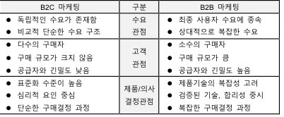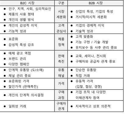 서두에서 언급한 것처럼 마케팅은 영업과 달리 시장을 출발점으로 삼았으며 시장에 대한 이해가 필수적이다. 그러나 시장을 B2C 시장과 B2B 시장을 구분해 보면 시장 세분화라든가 고객의 관심사 및 마케팅 믹스[3] 등 마케팅 주요 관점에서 B2C 시장과 B2B 시장은 표 I-2처럼 좀 다르다.
