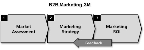 B2B 마케팅 3M의 첫 번째 단계인 시장의 평가(MA)는 마케팅 전략(MS)을 수립하기 위해 시장 환경, 고객, 경쟁사에 대해 조사하고 분석하는 것으로, 시장을 여러 가지 관점에서 조망하고 고객의 요구(Wants & Needs), 고객의 특성, 시장 동향 등을 조사하고 분석하여 이를 바탕으로 수요(Demand)를 예측한다. 또한, 경쟁사 및 경쟁 상품을 분석하여 경쟁 기업의 전략과 상품의 경쟁 우위(Competitive Advantage)와 차별화 요소를 파악한다. 즉, MA는 마켓 센싱[6](Market Sensing)을 통해 마케팅 전략을 수립하기 위한 시사점을 도출하는 단계라고 할 수 있다. B2B 마케팅 3M의 두 번째 단계인 마케팅 전략 수립(MS)은 시장 평가(MA) 결과를 토대로 고객 만족과 영업 성과, 브랜드 가치를 극대화할 수 있는 전략 및 실행 계획을 수립하는 단계이다. 즉, B2B 마케팅 4P Mix 및 B2B 브랜딩을 통해 구체적인 B2B 마케팅 프로그램을 수립하는 것이라 할 수 있다. 마케팅 전략 개발 시 기업 전략(Corporate Strategy)과 사업 전략(Business Strategy)을 검토하고 이와 합치(Alignment)되는 전략을 수립해야 하는데, 신제품의 경우 시장 진입 전략(Go-To-Market Strategy), 기존 고객과의 반복 거래를 고려할 때에는 어카운트 전략(Account Strategy)을 고민해야 한다. B2B 마케팅의 마지막 세 번째 단계는 마케팅 성과평가(MP)로 마케팅 프로그램을 실행하면서 투입된 비용과 성과를 비교하고 종합적인 마케팅 성과를 측정하는 단계로 그 결과는 반드시 마케팅 전략 수립(MS) 과정에 피드백되어야 한다. 기업 인지도, 사업 커버리지, 시장지배력 등을 평가하며 이것은 수익성 측면에서 매출액, 시장점유율 등으로 나타난다. 그 외 고객 만족도, 고객 충성도, 재구매율, 브랜드 인지도 등에서도 마케팅 활동의 성과를 파악해야 한다. 특히 사업 실주와 같은 B2B 영업 활동 결과로 발생하는 매몰비용(Sunk Cost)이라든지 포스트모템(Postmortem)을 통해 도출된 정량적, 정성적 효과 등은 마케팅 성과평가에 포함하는 것이 좋다. 그런데 B2C 시장과 달리 B2B 시장은 진입하기도 어렵고 B2B 마케팅의 의의, 즉 이 일을 왜 해야 하는지 그 동인(drivers)을 찾기도 쉽지 않은데 이는 거시적 동향을 파악해서 표준화된 요구를 잡아내는 B2C 마케팅의 역할이 중요한 B2C 사업에 비해 소수의 고객과 친밀한 커뮤니케이션을 통해 고객의 개별 니즈를 파악할 수 있는 즉, 무언지 잘 모르는 B2B 마케팅보다는 B2B 영업 활동이 더욱 효과적이라 생각하는 경향이 강하기 때문이다. 이와 같은 이유로 많은 사람들은 B2B 마케팅은 업무적으로 B2B 영업의 백업(Backup) 성격이 강하다고 생각한다. [7] 그렇다면 고객과 가장 가까이 있으면서 실질적인 구매를 야기시킬 수 있는 B2B 영업은 어떤 사람들이 어떻게 일을 하고 있을까?