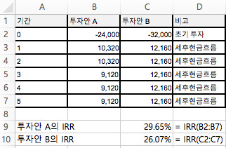 따라서 의사결정은 내부수익률이 높은 투자안 A를 채택한다.