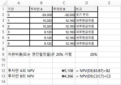 따라서 의사결정은 NPV> 0 이면서 값이 더 큰 투자안 A를 채택한다.