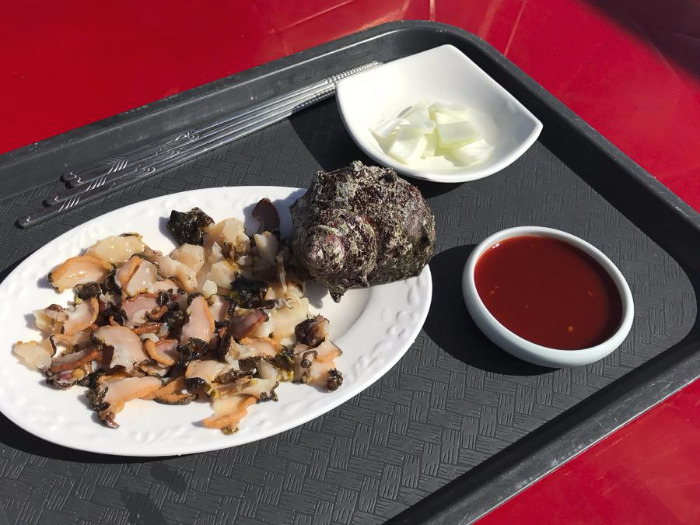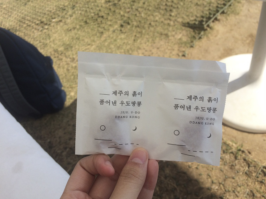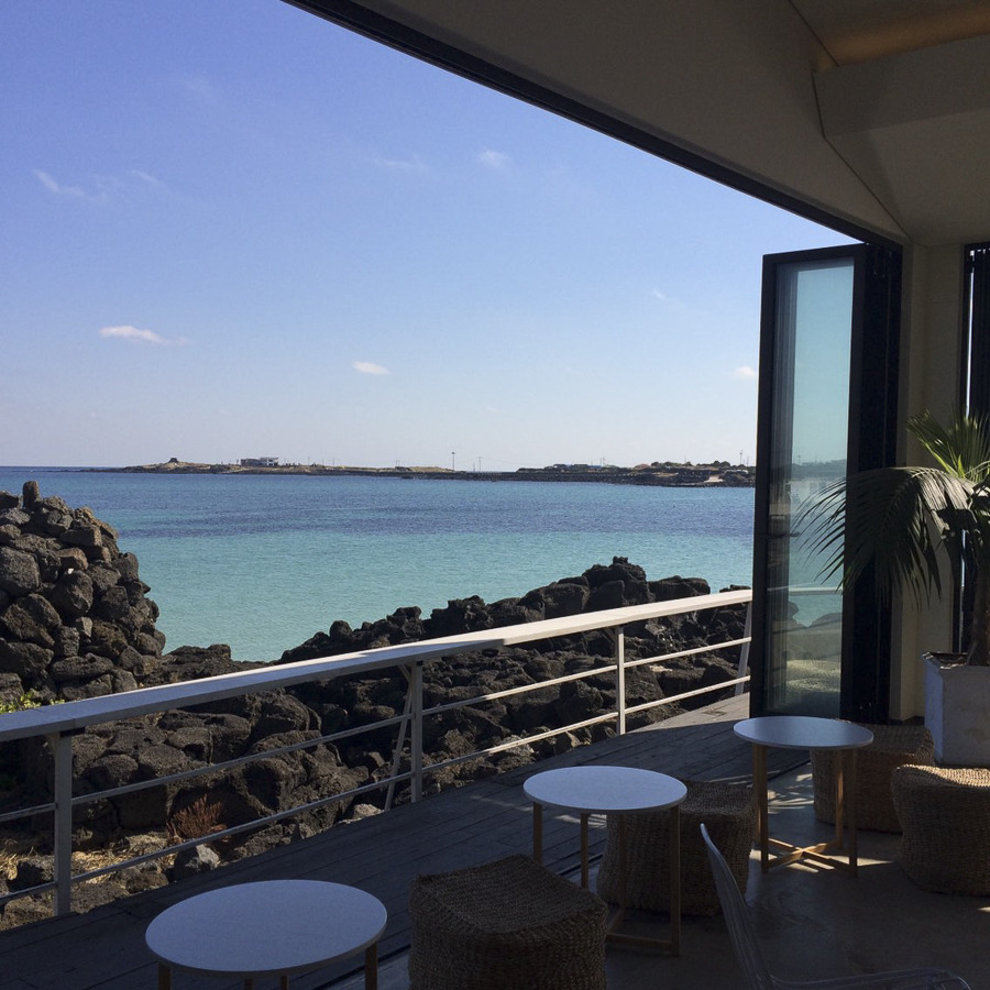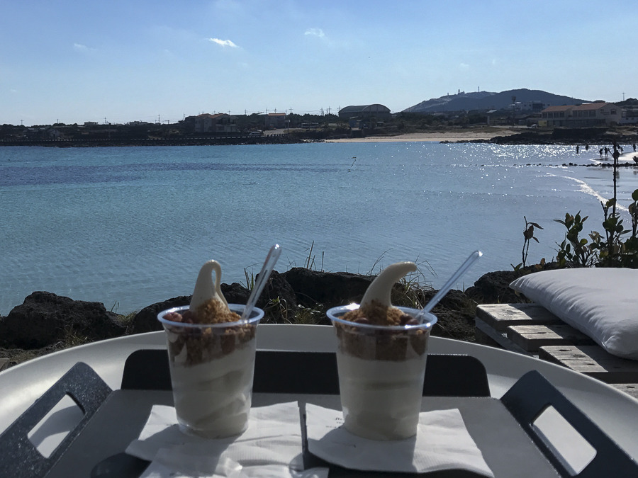 눈에 띄는 노점상에서 뿔소라를 한 접시 먹고 친구에게 추천받은 카페 블랑로쉐를 찾았다. 같이 간 막내가 들어서자마자 감탄사를 내뱉었다. 에메랄드빛 바다가 통유리 너머로 펼쳐져 있었다. 테라스에는 팔레트를 쌓아 만든 좌석이 놓여있었는데 그 위로 베이지색 그늘막이 넘실댔다. 땅콩 아이스크림을 하나씩 사 들고 테라스에 자리를 잡았다. 그날은 유독 사람이 없어서 한적하기까지 했다. 20분 정도 앉아있었나 했는데 한 시간이 훌쩍 지나있었다. ‘이번 제주도 여행은 이걸로 됐다!’는 생각이 절로 들 정도로 훌륭했다.