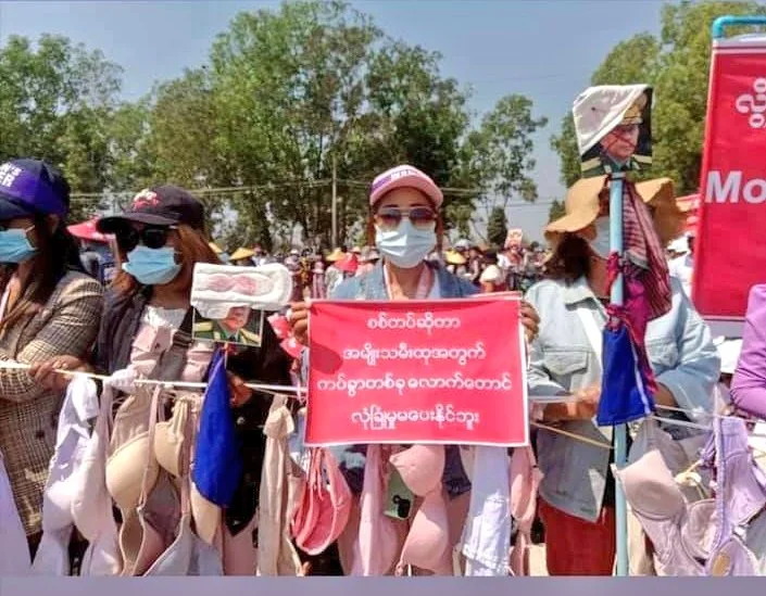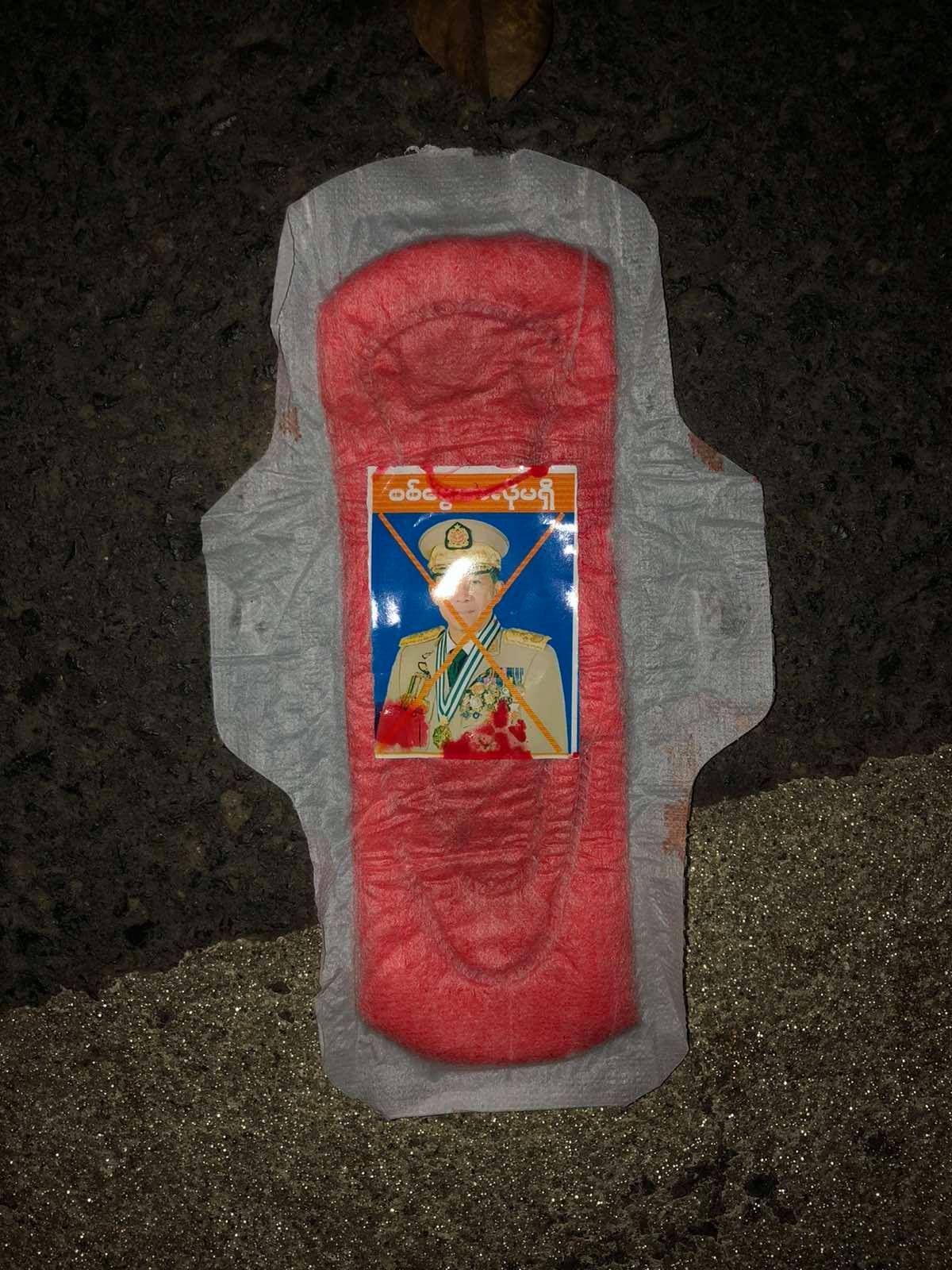 이를 이용해 까친 주 미치나의 여성들은 시위대의 안전과 군경의 기분 더러움을 위해 옷장을 털었습니다. 빨갛게 칠한 생리대에 군부 지도자 민 아웅 흘라잉의 얼굴을 붙여 길에 뿌리지 않으면, 속옷과 생리대로 시위 저지선을 만들어 가까이 다가오는 군경의 폰을 단숨에 빼앗아(?) 버리고 있습니다.