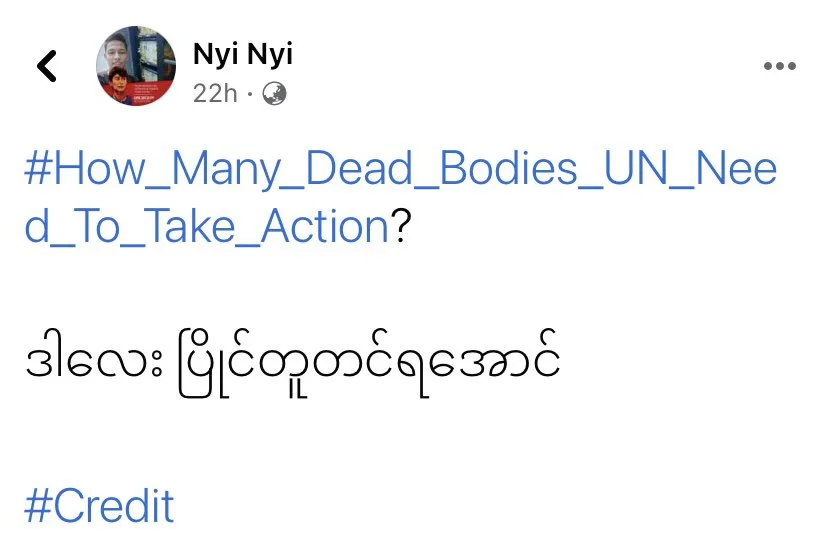 니니 아웅 텟 나잉은 시위에 참가하기 직전 페이스북에 "지금 우리 모두 함께 일어납시다" 라는 말을 남기고 먼 길을 떠났습니다.