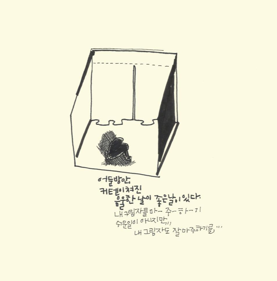 어찌할 수 없는 질척거리는 시간들에 심하게 휩싸이는 날에는 커튼을 모조리 치고 웅크려 앉아 있고 싶었지만, 그러기엔 내 안에 나를 돌보는 엄마 같은 자아는 그런 것을 허용해주지 않았다.