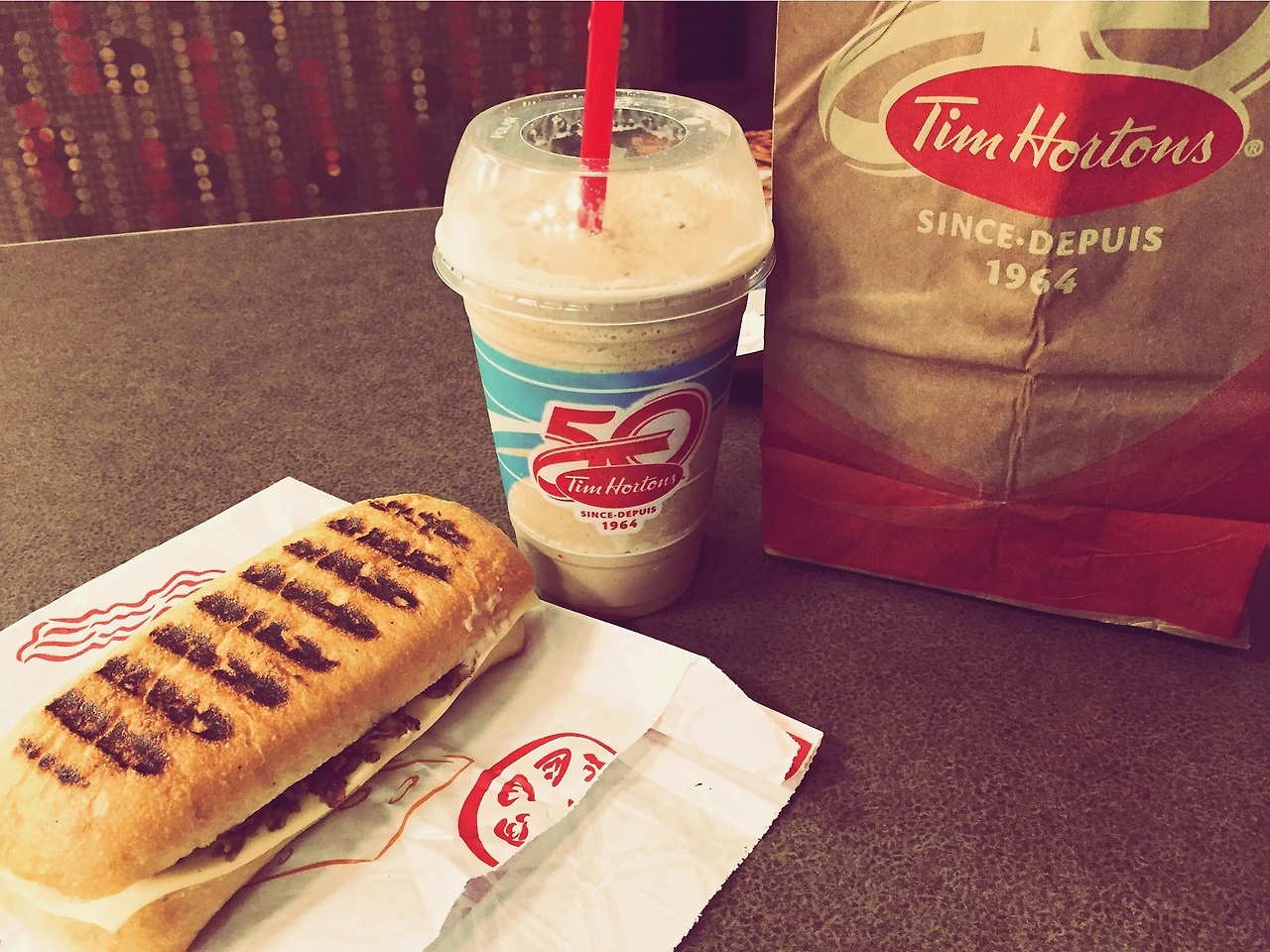 화장기 없는 얼굴로 원피스만 겨우겨우 뒤집어쓰고 호텔 앞의 '팀 홀튼'으로 향했다. 몰골이 말이 아니었기에 같이 온 승무원들과 마주치고 싶지 않아 후다닥 들어갔다. 일단 끼니를 때울 생각이니 도넛 보다도 '스테이크 앤 치즈 파니니'와 '아이스드 캡'을 주문하고, 만족스럽게 한입 와앙 베어 문 순간