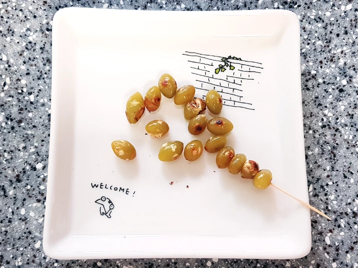 4. 노란 빛깔과 구수한 냄새에 감탄하며 이쑤시개로!! 집어 먹는다. 이쑤시개 하나에 세 개, 네 개 꽂아서 연달아 빼먹으면 더 행복하다.