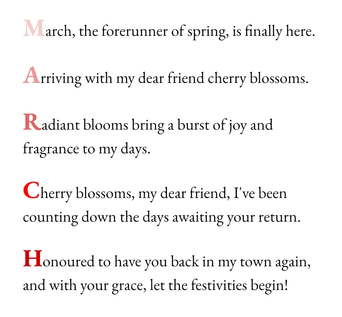 아직 벚꽃 소식이 없는 고국에 계신 분들께도 이 벚꽃 사진을 보여드리고 싶은데, 인스타그램이 아닌 이곳에 달랑 사진 한 장만 올릴 수는 없잖아요. 그래서 부득이 MARCH의 첫 글자들을 따서 어쭙잖게 5행시를 지어봤습니다.