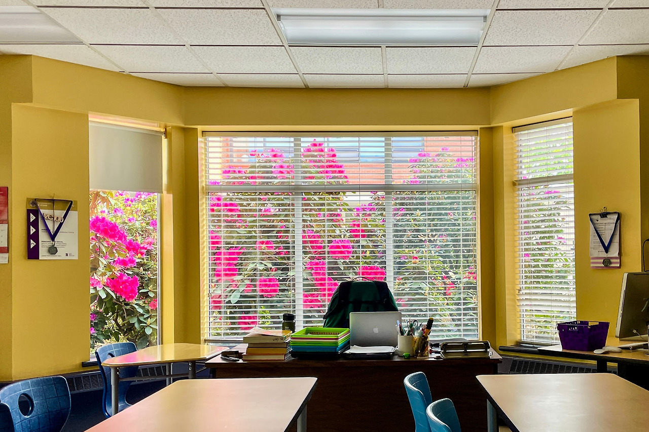 학년말에 가까워지며 몸도 마음도 많이 지치는 매년 이맘때, 교실 앞 화단에 만개한 진달래들이 아름답습니다. 아침 출근 시 교실 문을 열 때마다 반겨주는 이 광경이 감사합니다. 억만장자 일론 머스크의 사무실도 이렇게 예쁘지는 않을 것 같습니다. 자세를 고쳐 앉을 때마다 삐그덕 거리는 오래된 교사 의자가 편안합니다. 10년 넘게 앉았더니 엉덩이 닿는 부위가 맞춤 제작한 메모리폼처럼 딱 맞습니다.